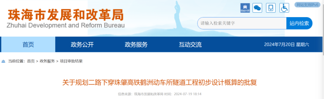 7月19日,珠海市发展和改革局官网发布《关于规划二路下穿珠肇高铁鹤洲动车所隧道工程初步设计概算的批复》,意味着该工程进度刷新。