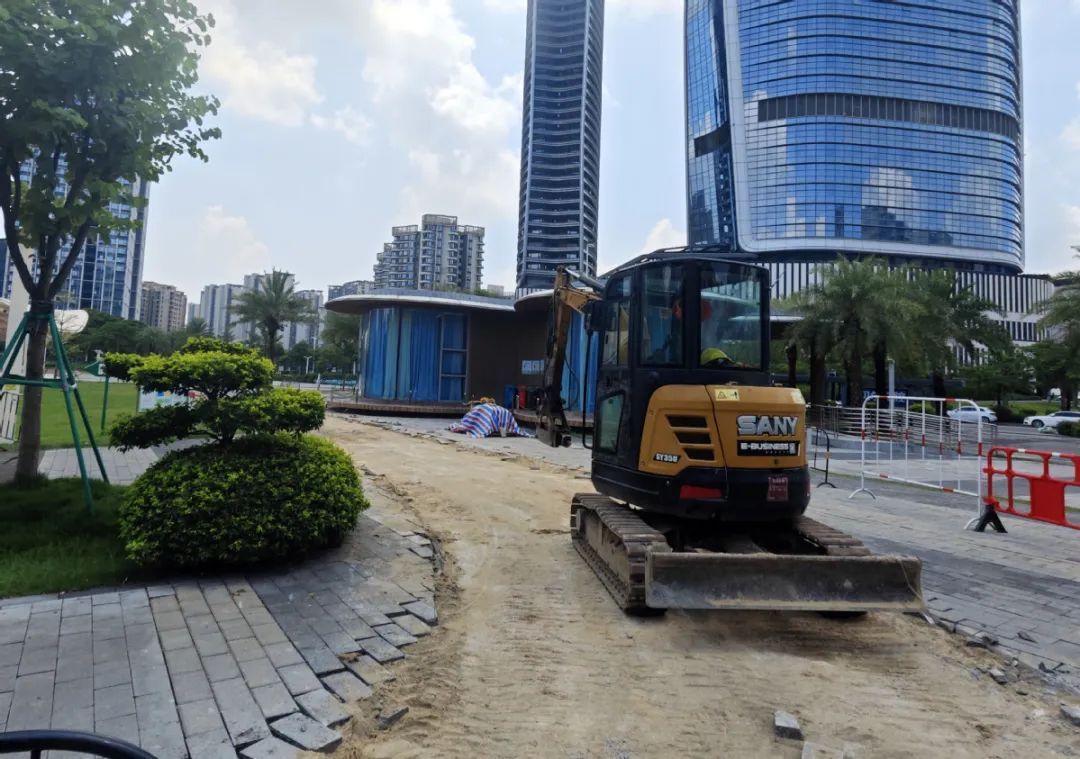 在金山公园,改造施工区域已设置围挡,挖掘机、推土机正忙着平整场地,工人们各司其职加紧施工。