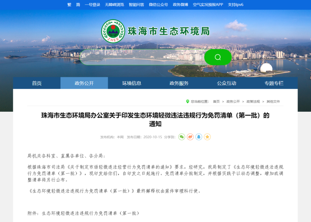 ▲珠海市生态环境局发布免罚清单,对违法行为轻微并及时纠正,没有造成危害后果的环境违法行为不予行政处罚。