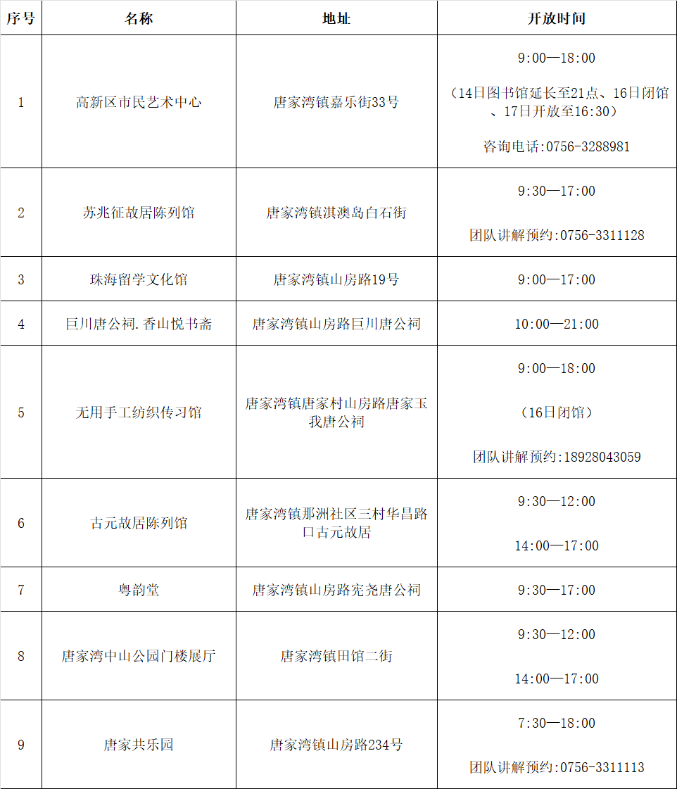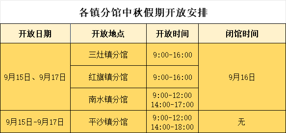 为更好地为市民提供公共文化服务,方便广大市民朋友节假日到图书馆、文化、文博场馆进行游览、学习,现将中秋节假期(9月15日—9月17日)期间开放时间安排通告如下: