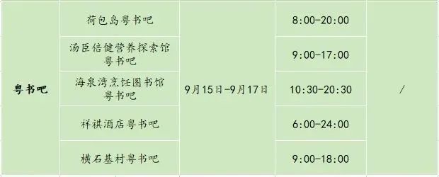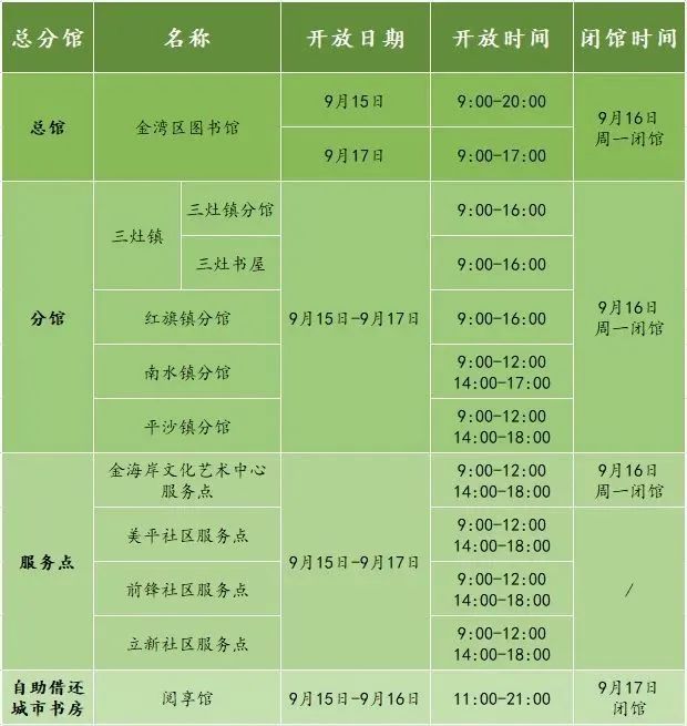 根据国务院办公厅《关于2024年部分节假日安排的通知》,金湾区图书馆总分馆2024年中秋节假期(9月15日—9月17日)开放时间安排如下: