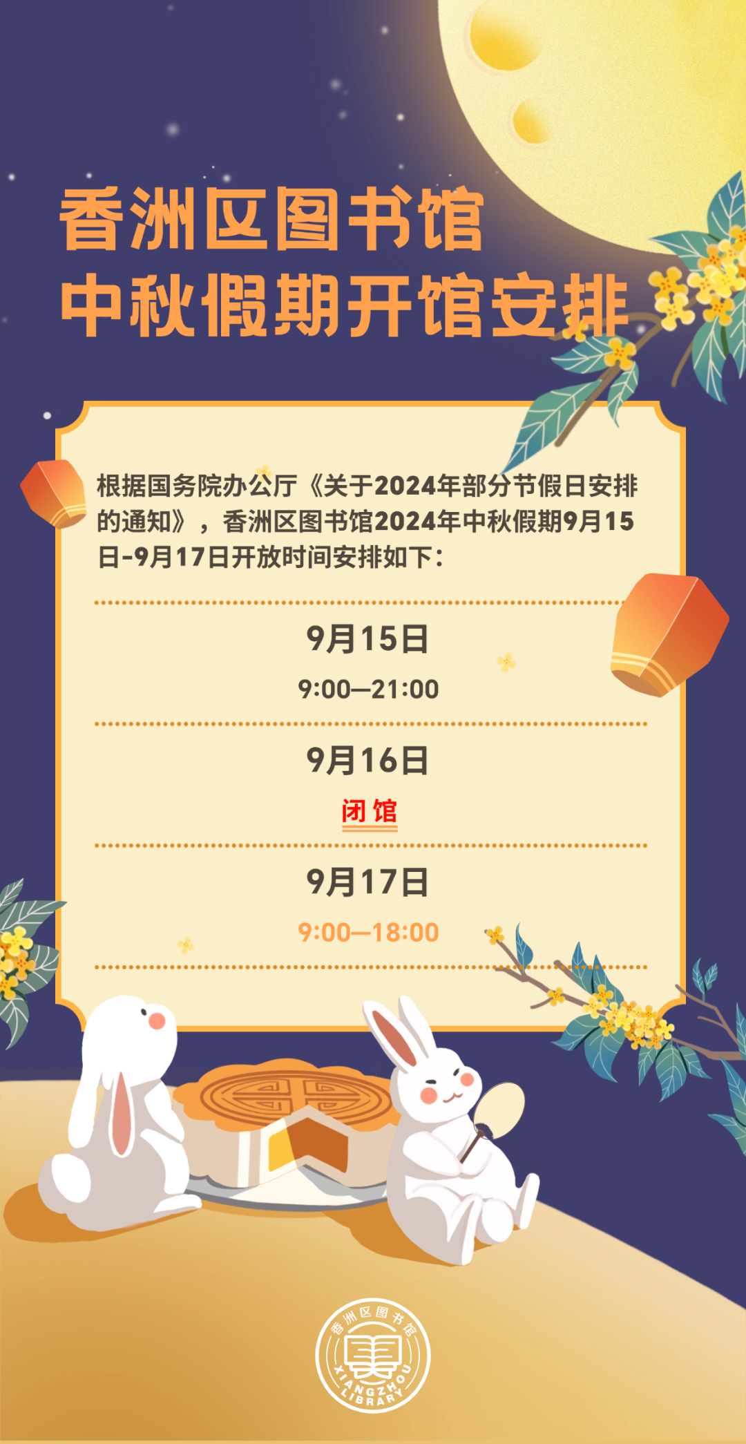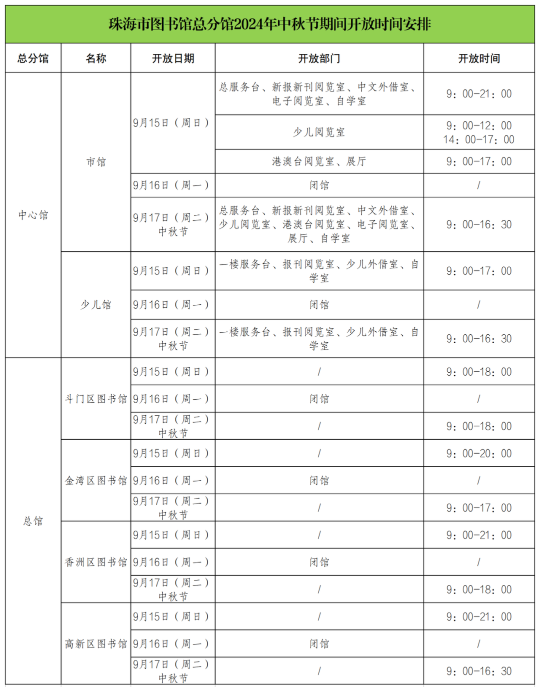 根据国务院办公厅相关通知精神,结合珠海市公共图书馆各总分馆实际情况,2024年中秋节开放时间安排如下: