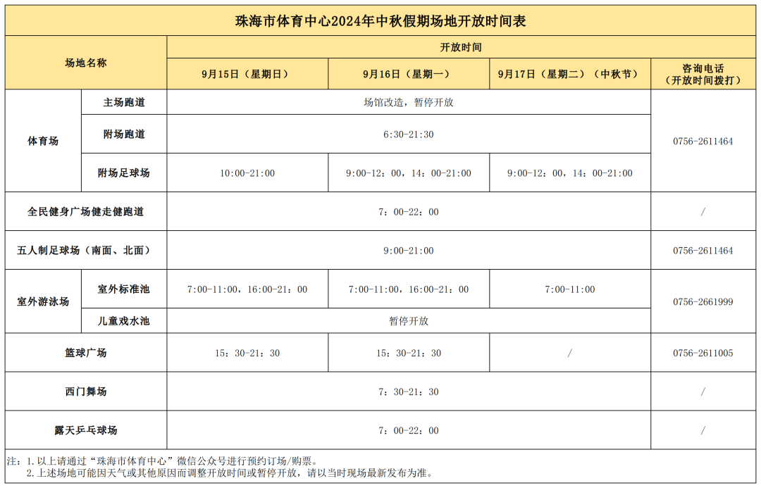 月满中秋,珠海市体育中心祝福您及家人团团圆圆,幸福安康。愿您的生活如诗如画,如梦如幻。祝您中秋快乐!2024年中秋假期(9月15日—17日),体育中心场地开放情况如下:
