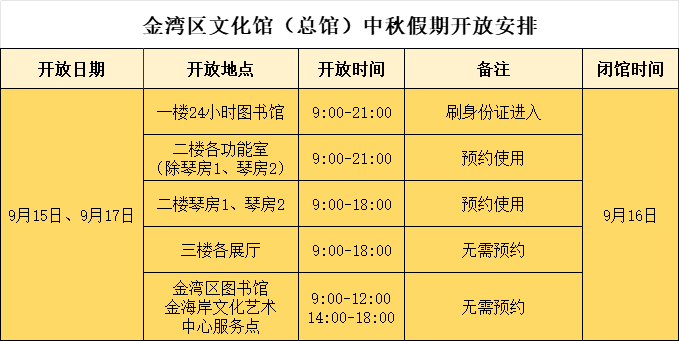 根据国务院办公厅《关于2024年部分节假日安排的通知》,金湾区文化馆2024年中秋假期9月15日—9月17日开放时间安排如下: