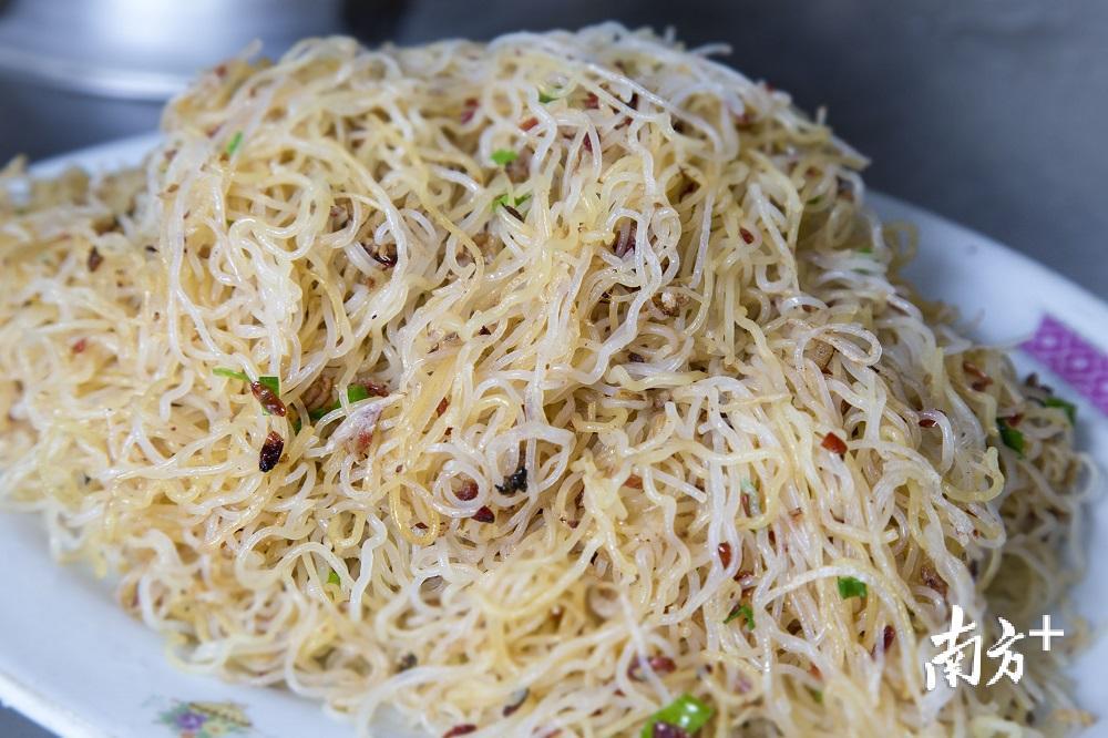 “鱼散粉”是松口古镇特色传统美食之一,将新鲜河鱼捣碎后,把姜、鲜河鱼肉米粉、酒糟、盐味等放入锅中翻炒,炒至熟成后即可,入口香、辣、耐人寻味,别具一格。