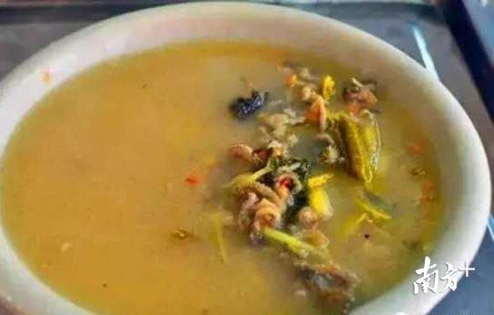 “羊醋汤”是松口家家户户的家常菜,将羊肉、羊肚切成小块后,将酒糟、姜丝、酸醋、盐味等食材加入开水中煮熟后即可食用。