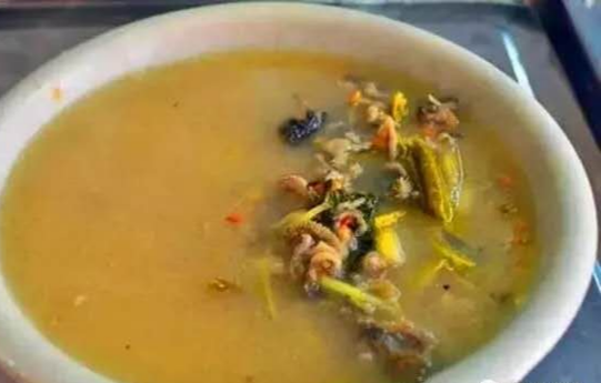“羊醋汤”是松口家家户户的家常菜,将羊肉、羊肚切成小块后,将酒糟、姜丝、酸醋、盐味等食材加入开水中煮熟后即可食用。