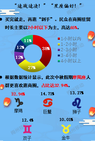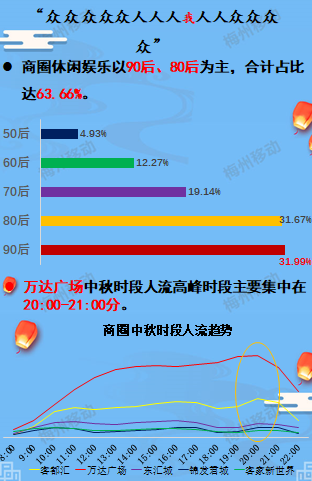 中秋佳节,逛街“剁手”仍是市民的“心头好”。城市商圈热度不减,据大数据报告显示,万达广场人气最旺,客都汇客流增幅最高,达到132.15%。商圈休闲娱乐以90后、80后为主,合计占比达63.66%。万达广场中秋时段人流高峰时段主要集中在20:00-21:00分。