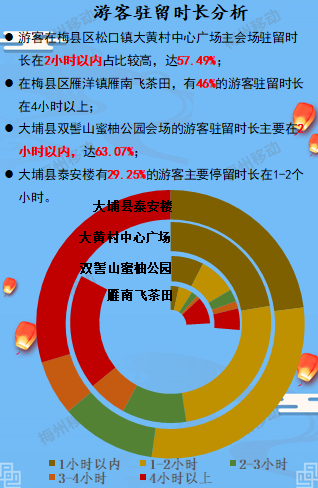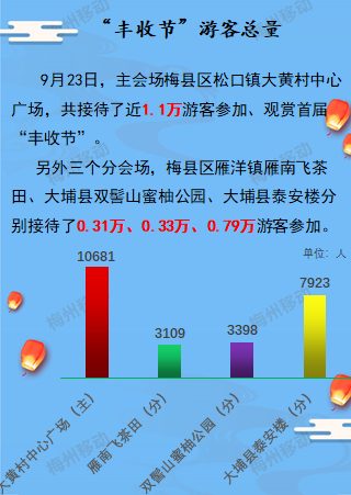 记者通过梅州移动大数据了解到,9月23日,主会场梅县区松口镇大黄村中心广场,共接待了近1.1万游客参加、观赏首届“丰收节”。另外三个分会场,梅县区雁洋镇雁南飞茶田、大埔县双髻山蜜柚公园、大埔县泰安楼分别接待了0.31万、0.33万、0.79万游客参加。其中,游客在梅县区松口镇大黄村中心广场主会场驻留时长在2小时以内占比较高,达57.49%;在梅县区雁洋镇雁南飞茶田,有46%的游客驻留时长在4小时以上;大埔县双髻山蜜柚公园会场的游客驻留时长主要在2小时以内,达63.07%;大埔县泰安楼有29.25%的游客主要停留时长在1-2个小时。