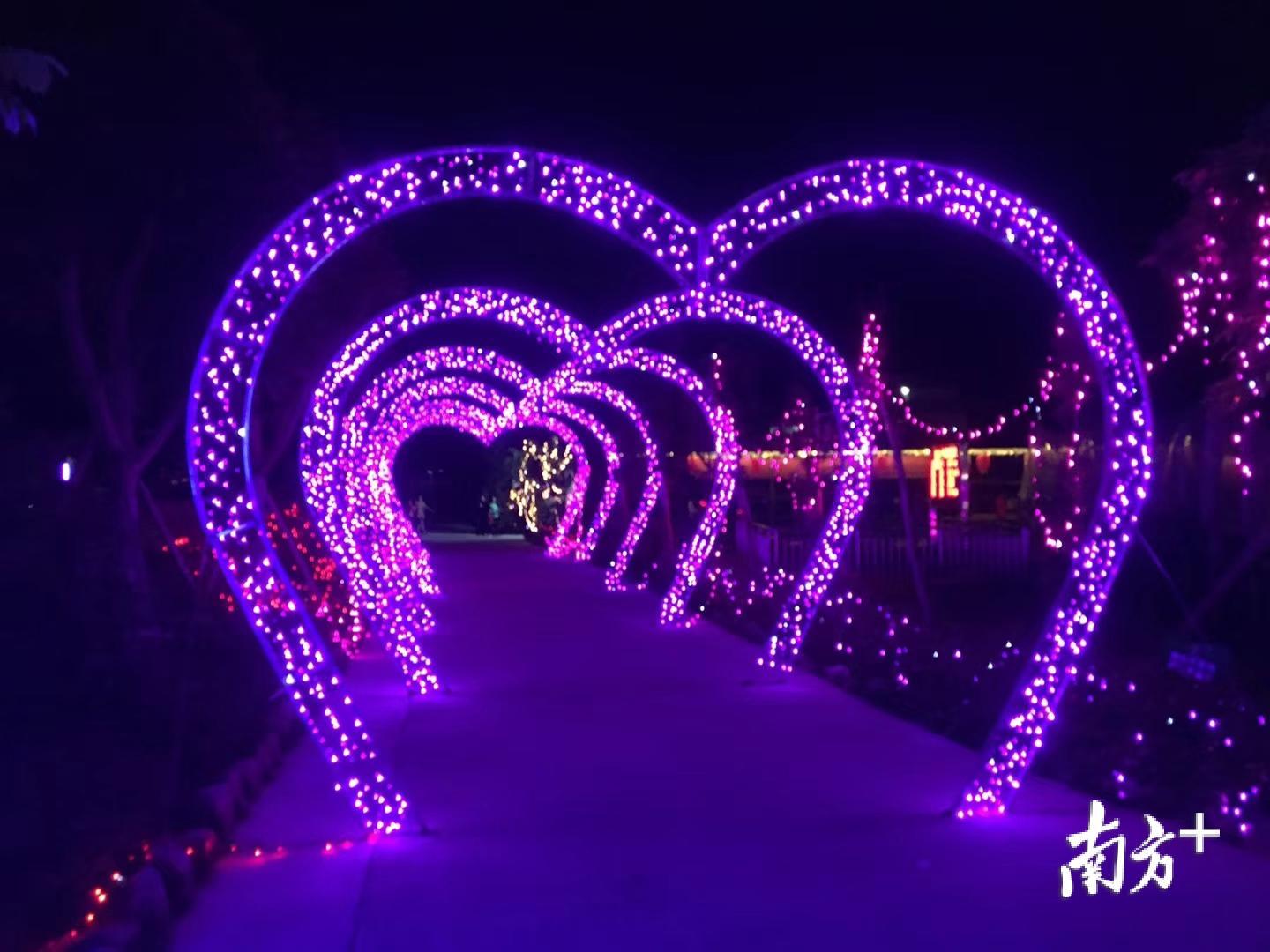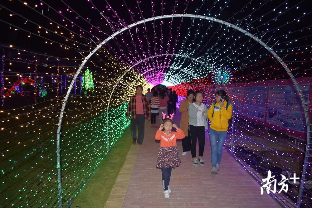 农旅园的草坪上也布置了五颜六色的灯具,漫地星辉,层层组合成各种图案,游玩的市民边走边赞叹色彩的绚丽。其中,最吸引市民的就是彩灯环绕组成的“时光隧道”,走进五彩斑斓的隧道,便进入灯的海洋,吸引了众多市民驻足拍照。