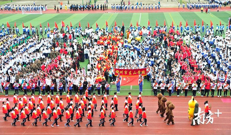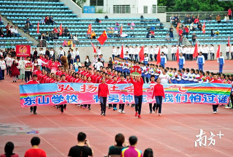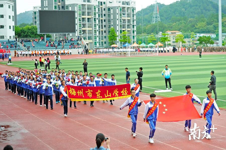 3日上午,梅州市东山学校举行“弘扬社会正气•创建文明城市”誓师大会暨学校田径运动会开幕式。梅州市教育局副局长朱志强、梅江区人民政府副区长罗涤权、梅江区教育局副局长张志及邀请而来的近3000多名学生家长,一起欣赏了东山系列学校的入场仪式,创意十足的表演逗得现场观众们掌声、欢呼声不断。