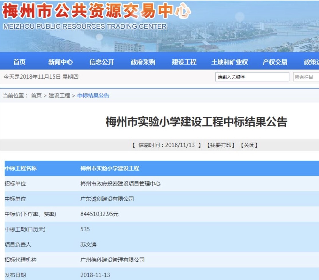 日前,记者从梅州市公共资源交易中心官网了解到,梅州市实验小学建设工程中标结果已公布,最终由广东诚创建设有限公司以约8445万的价格取得,建设工期预计在一年半左右。