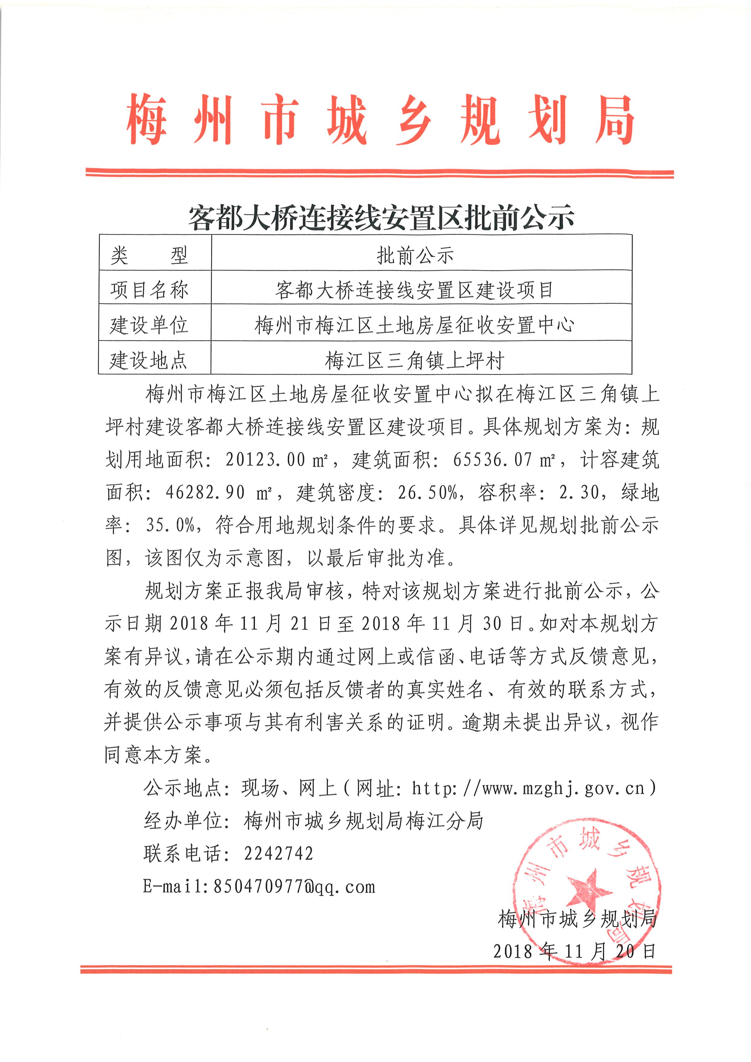 目前,规划方案正报梅州市城乡规划局审核,特对该规划方案进行批前公示,公示日期2018年11月21日至2018年11月30日。如对本规划方案有异议,可在公示期内通过市城乡规划局的网上或信函、电话等方式反馈意见。