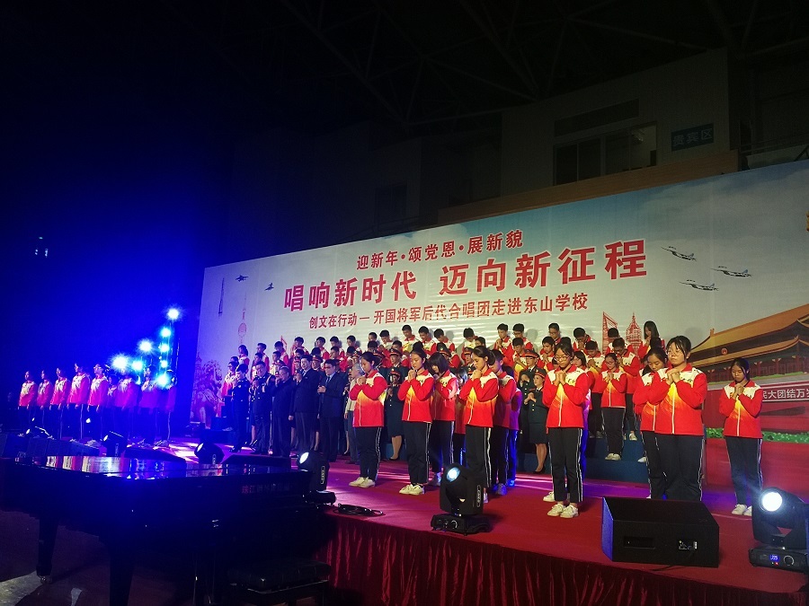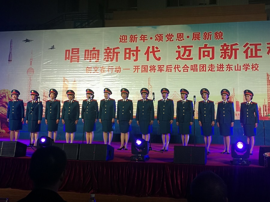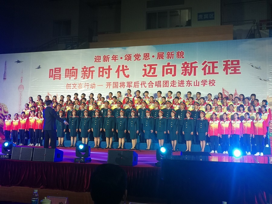 此次演出是开国将军后代合唱团第4次来到东山系列学校进行表演,为师生们带来了满满的红色正能量。据了解,开国将军后代合唱团成立于2008年6月8日,今年是成立的第十年。该合唱团由200多名开国将军的后代组成,为继承和发扬老一辈革命精神,他们组成了这支新的队伍。该合唱团以传承和弘扬红色文化,振奋民族精神,教育下一代为宗旨,让更多的年轻人了解和接受红色文化。合唱团自成立以来,先后在全国巡回演出400余场,社会反响强烈,广受人民群众欢迎。