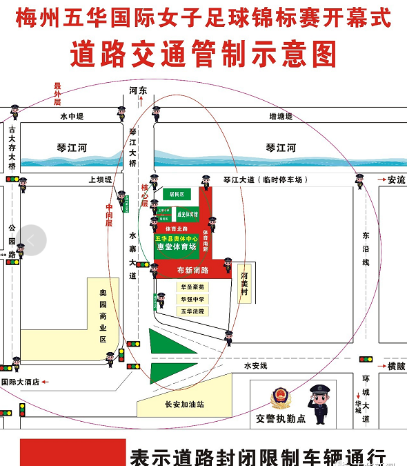 记者从五华县公安局获悉,2019年1月17日晚、1月20日晚,在五华县奥林匹克体育中心举行梅州五华国际女子足球锦标赛开幕式和闭幕式,为确保开幕式期间环奥林匹克体育中心周边道路安全畅通有序,五华县公安局交警大队根据《中华人民共和国道路交通安全法》第三十九条规定,届时将对环奥林匹克体育中心周边道路进行交通管制。请广大市民给予理解和支持,服从交通民警和工作人员指挥,并提前做好绕行线路或徒步前来观看开幕式节目的计划安排,以免影响出行。