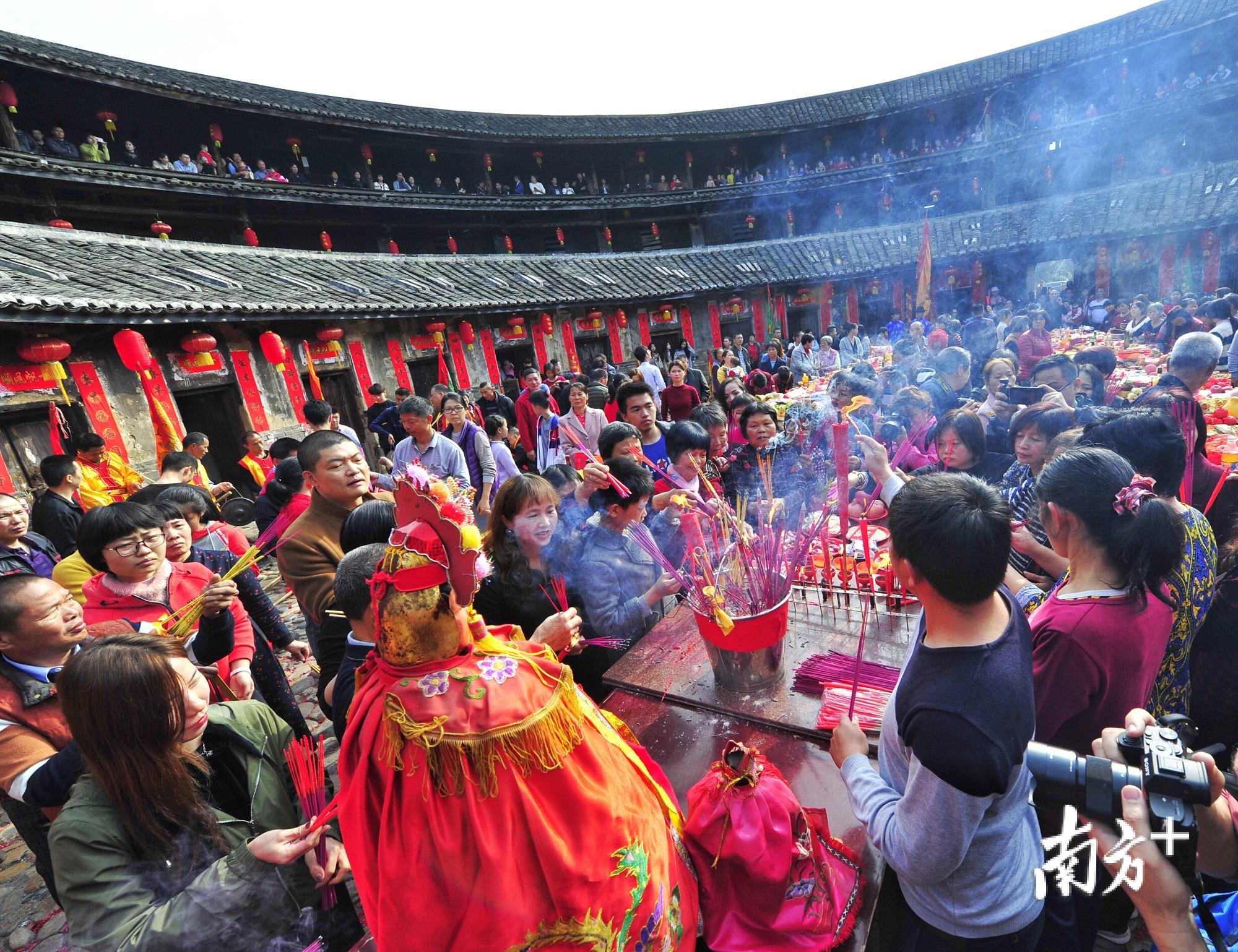 鞭炮声、锣鼓声、乐曲声和着人们的欢呼声,把祈福活动推向高潮。村里的男女老少纷纷在观音神像前斟茶敬酒,焚香点烛,最后是各家各户的祈愿者叩首跪拜行大礼以表虔诚之心,祈求“家和万事兴”。每家每户把贡品放进篮子里,高高兴兴地从土围楼正门抬回家中。