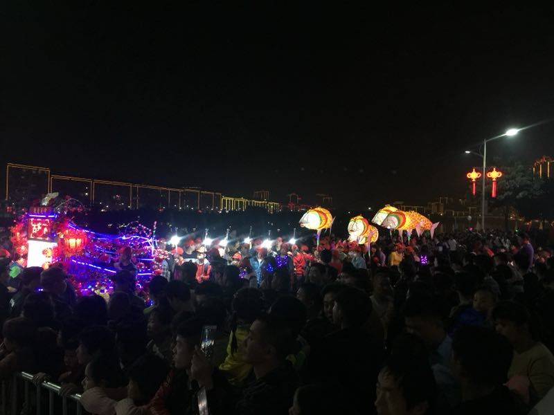 夜幕还未降临,五华县下坝村的沿江路却早已人山人海,大型迎灯会将在这里上演。晚上8点45分,精彩的文艺表演过后,迎灯游行活动正式开始,近万名群众到现场参与“迎灯”,现场锣鼓喧天,甚是热闹。