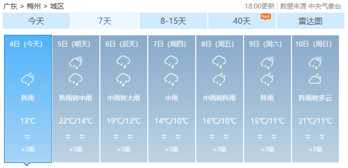 俗话说“春无三日晴”,三月的梅州天气阴晴不定,昨天还是以阴雨为主的灰色暗调,今天就转为蓝天白云相伴,但雨水的停歇是暂时的,预计未来几天梅州天气的主旋律将会是雨水。