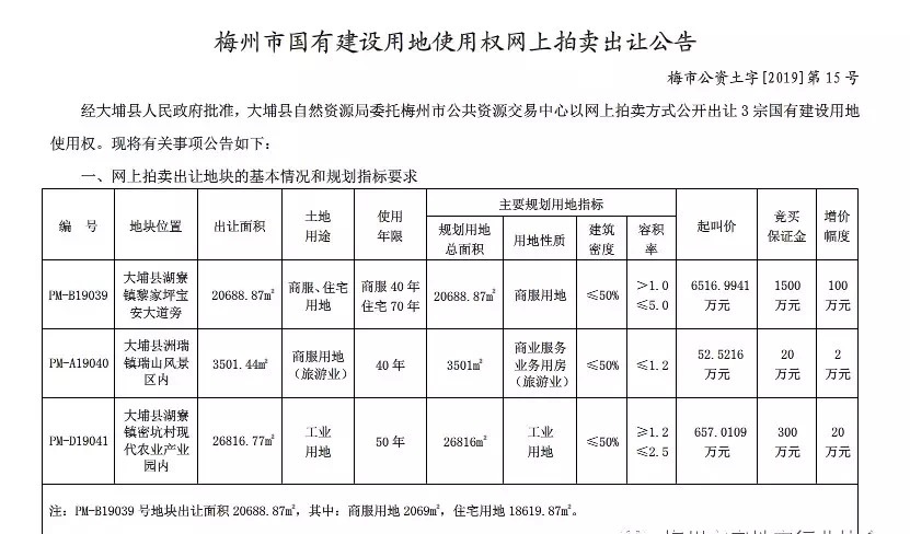 近日,梅州市公共资源交易中心网站发布公告,公开拍卖大埔县3宗地块,出让面积约5.1万㎡,包含商服用地、工业用地、商服住宅用地,其中,PM-B19039号商服住宅用地地块值得注意。