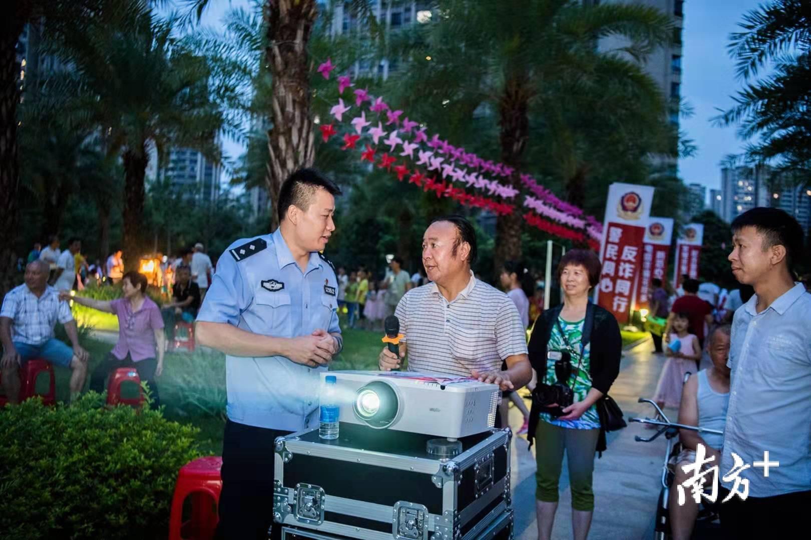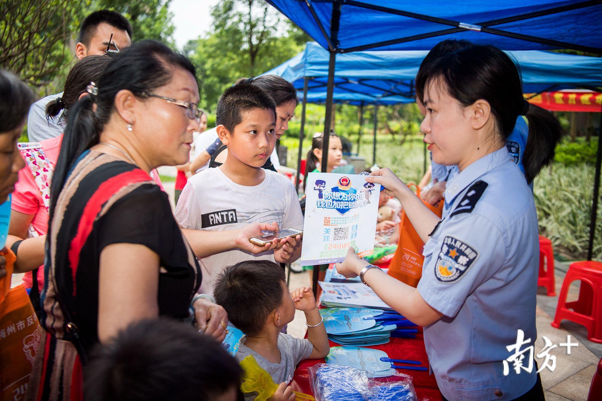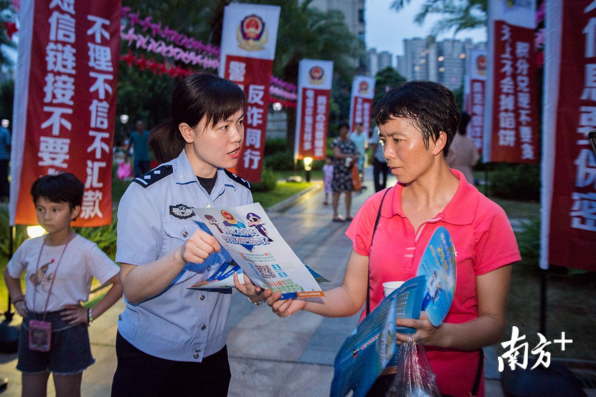 7月13日晚,梅州市公安局民警会同志愿者深入到梅县富力城小区中心广场开展反电信网络诈骗主题宣传活动,为小区住户讲解常见的诈骗形式和防范方法。活动现场,民警设立了宣传版面、现场咨询台,并为住户发放反诈骗宣传单和印有反诈骗宣传知识的小礼品。