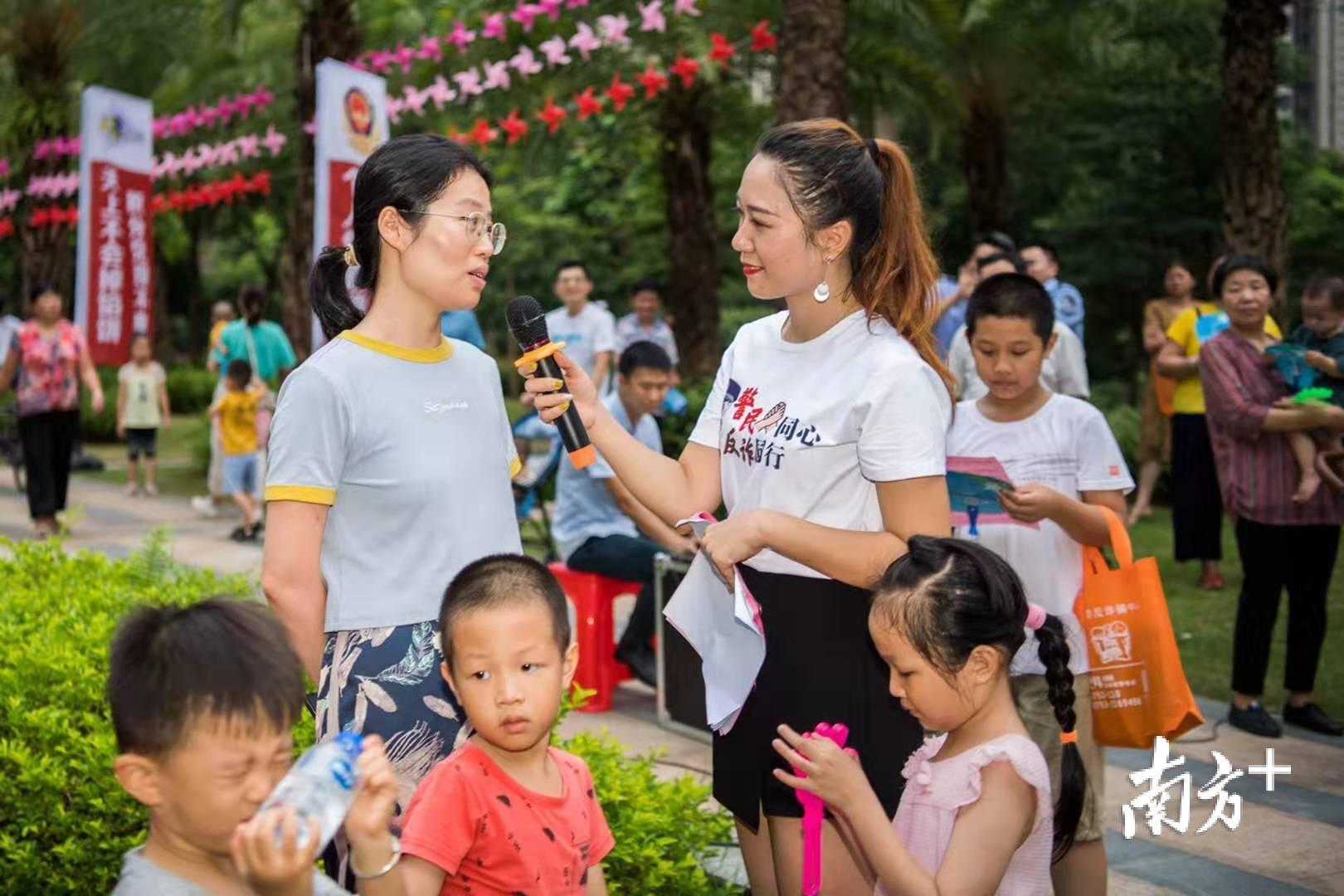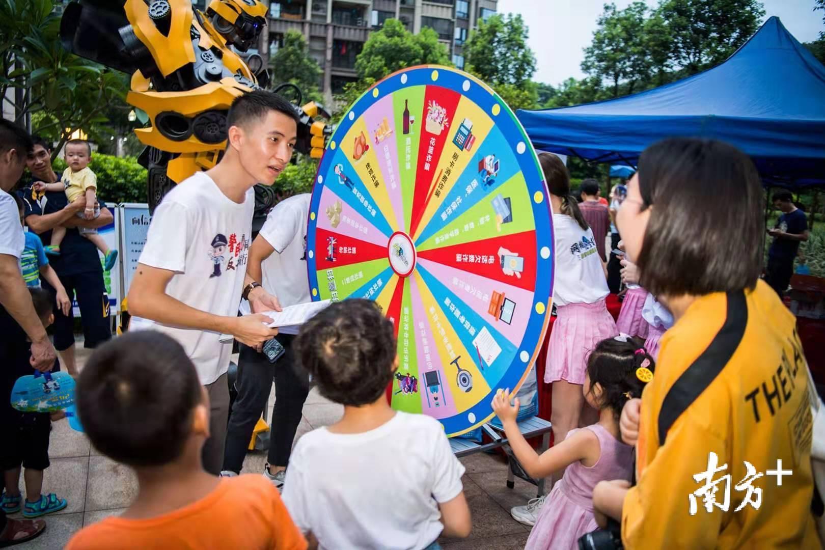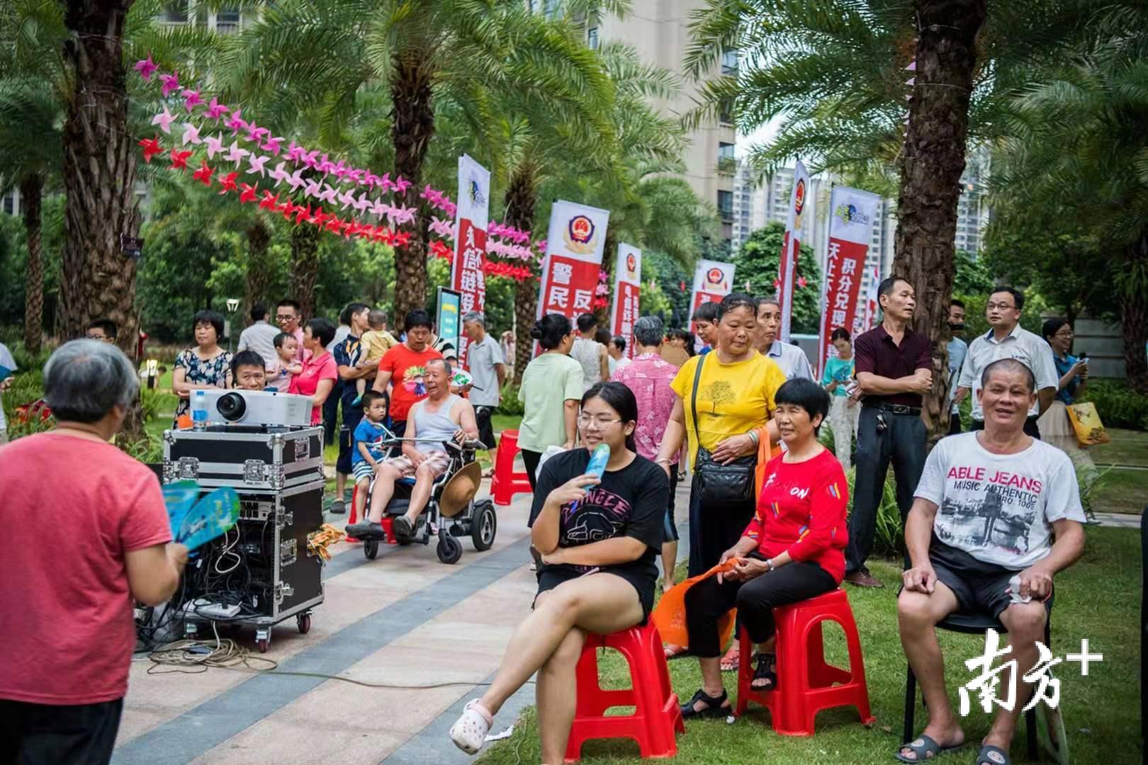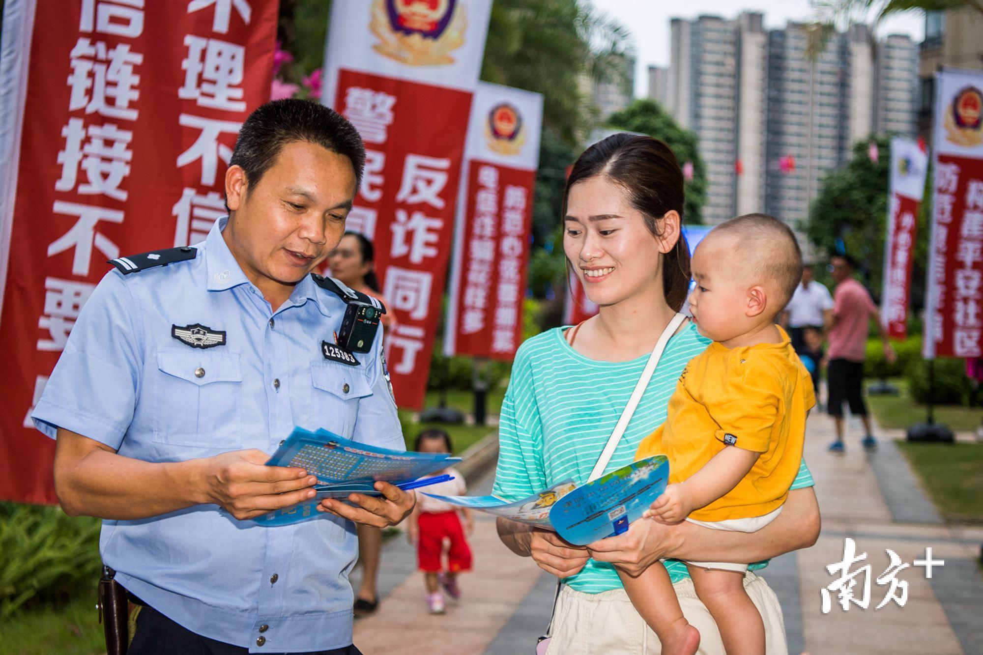 7月13日晚,梅州市公安局民警会同志愿者深入到梅县富力城小区中心广场开展反电信网络诈骗主题宣传活动,为小区住户讲解常见的诈骗形式和防范方法。活动现场,民警设立了宣传版面、现场咨询台,并为住户发放反诈骗宣传单和印有反诈骗宣传知识的小礼品。