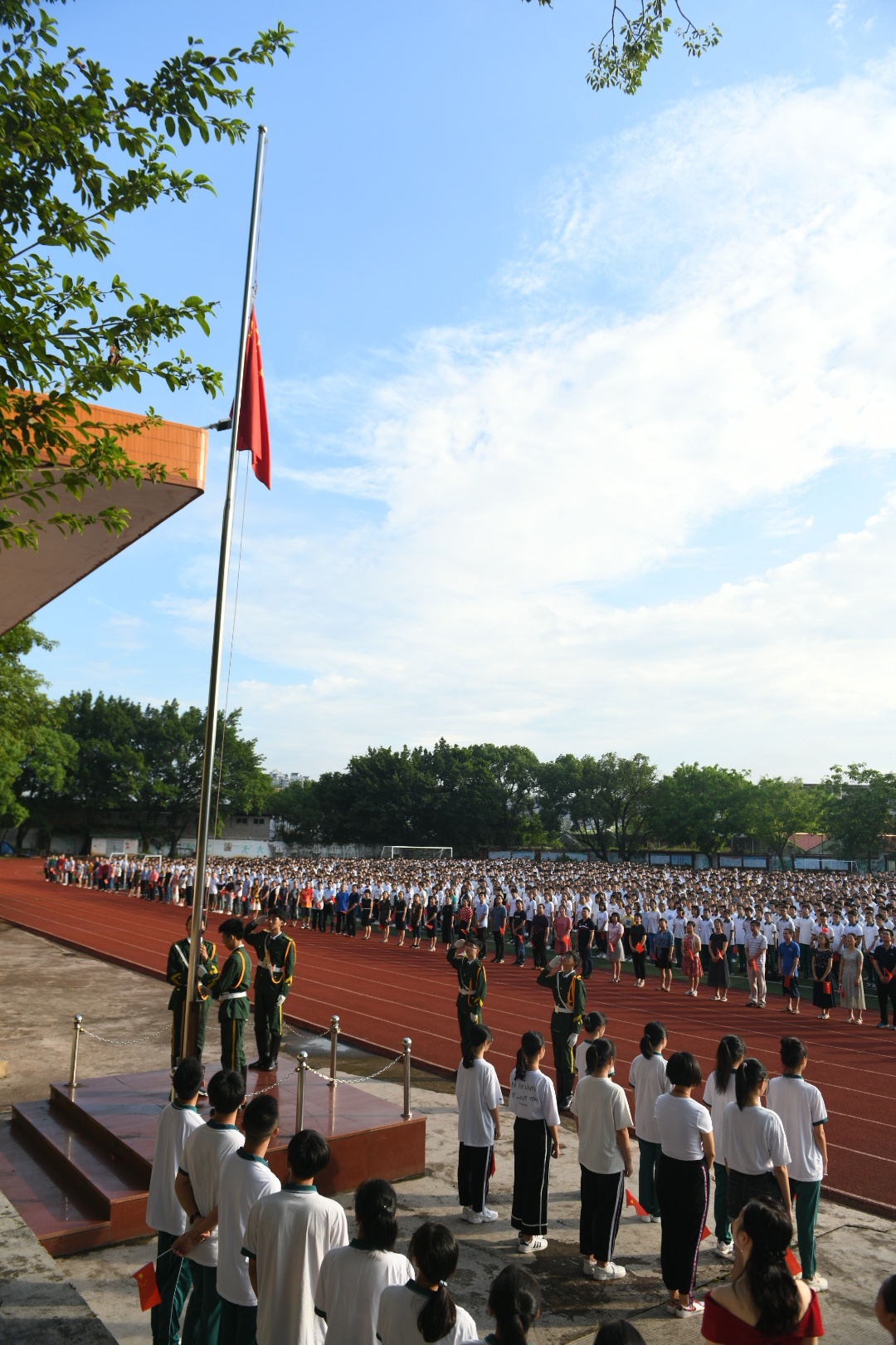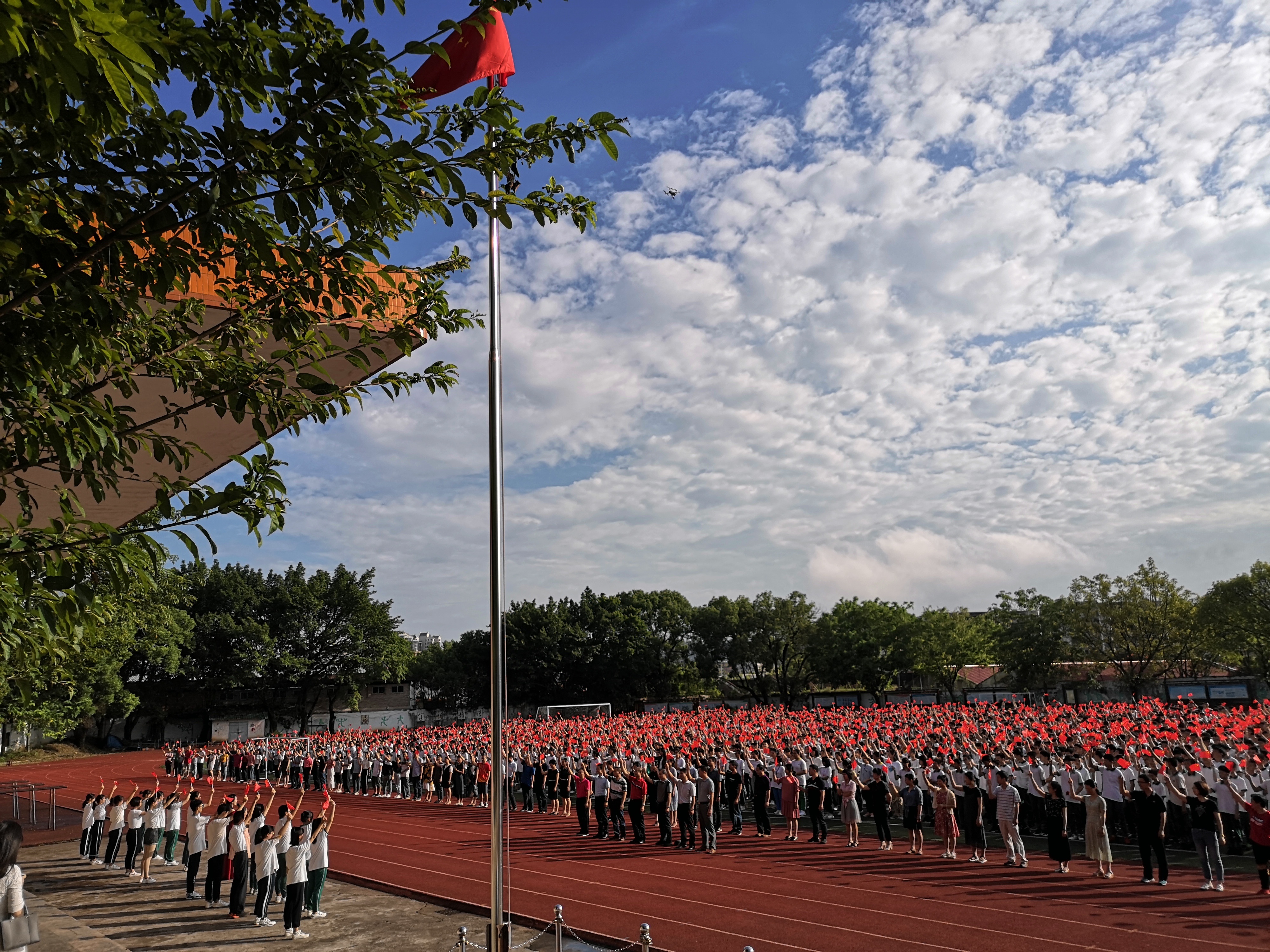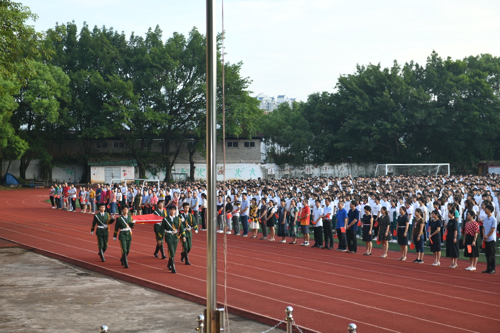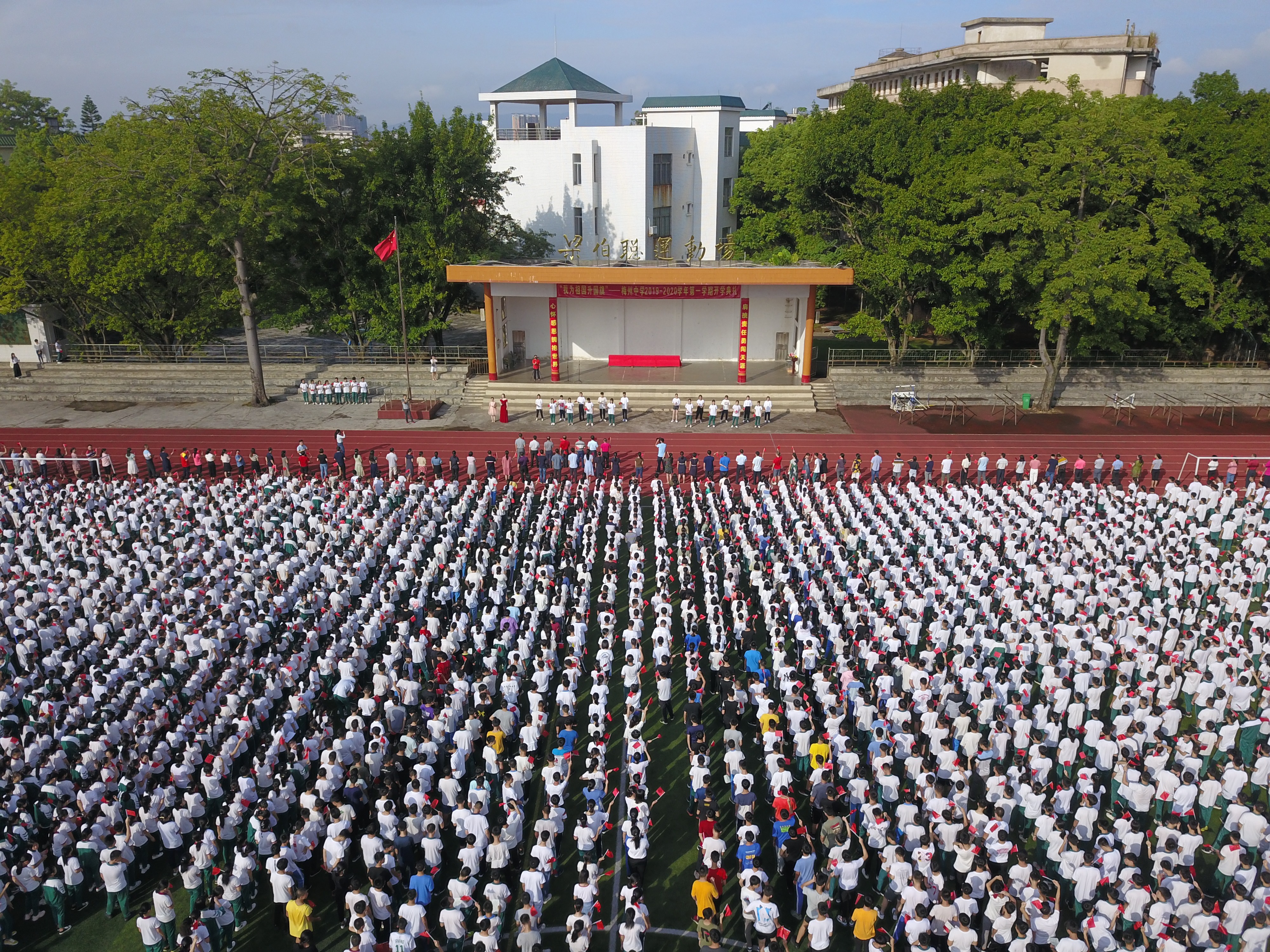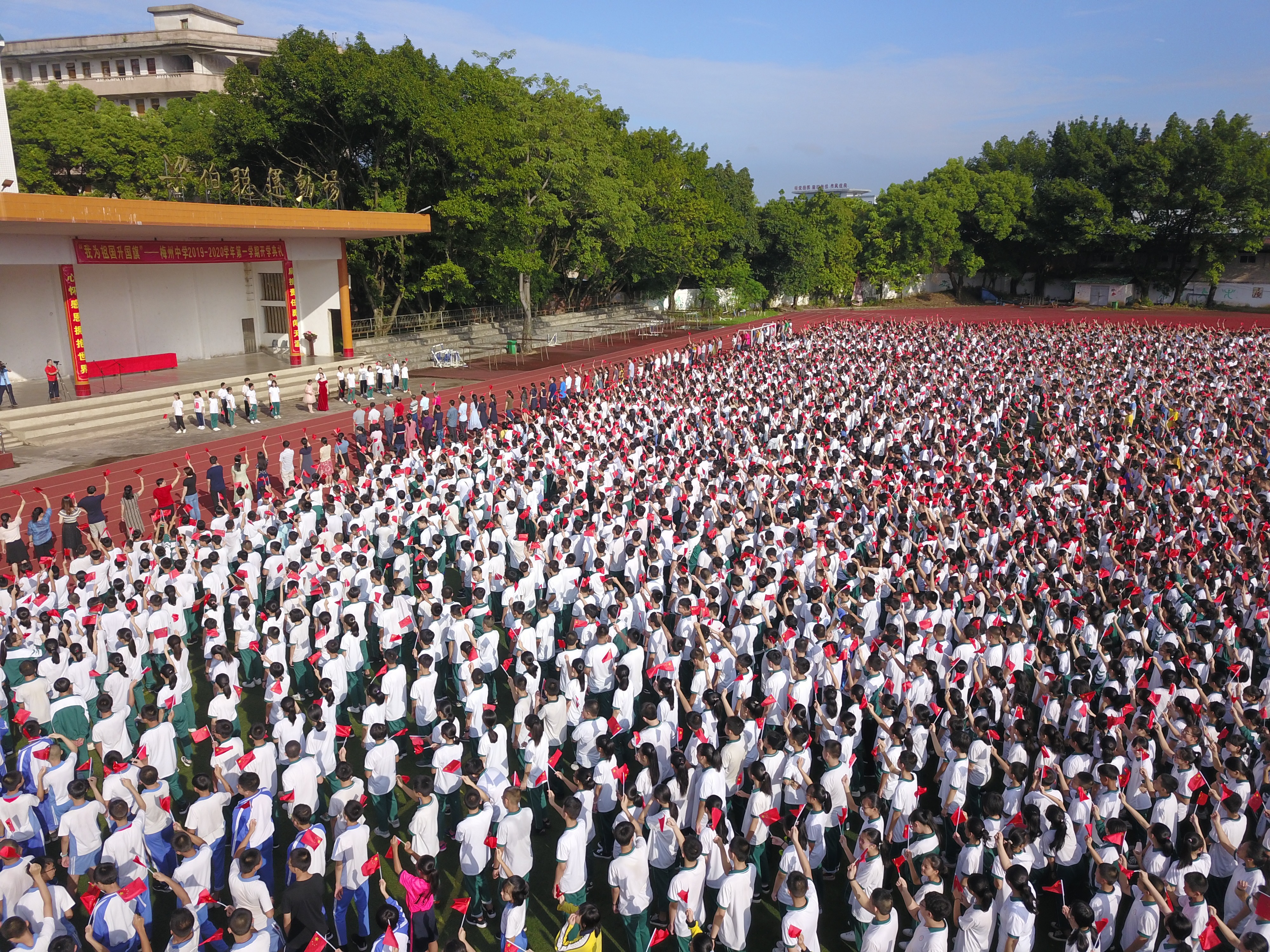 9月2日,开学第一天,梅州市各中小学校举行盛大开学典礼。在梅州中学,4600多名师生在学校操场举行“我为祖国升国旗”开学典礼,高唱《我和我的祖国》。