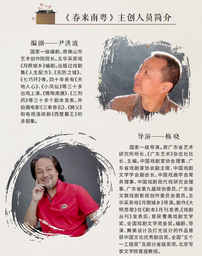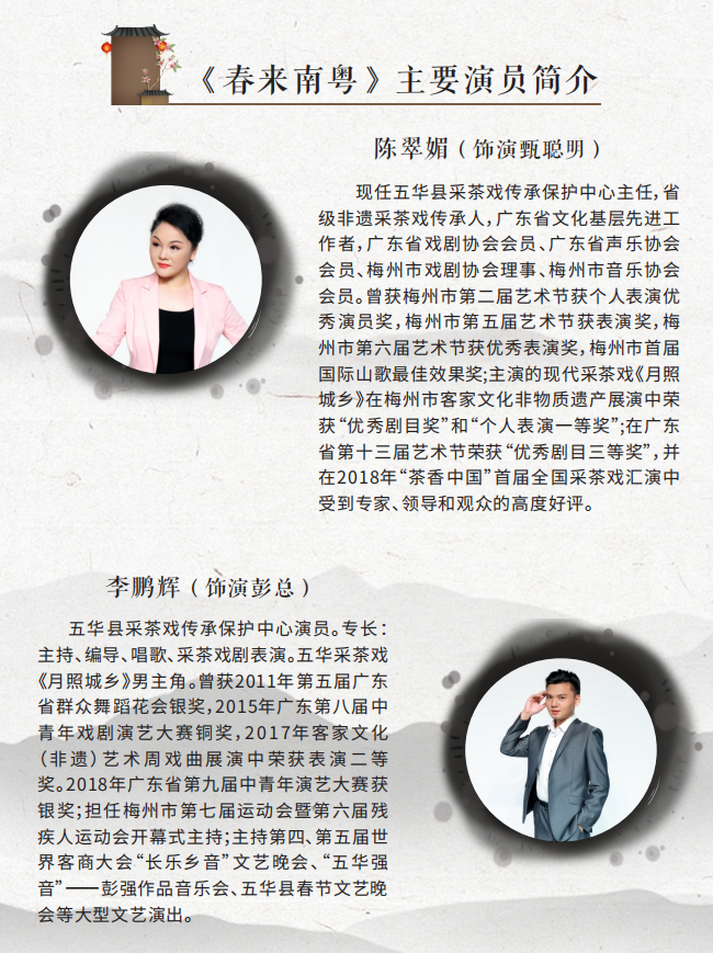 《春来南粤》是一部反映精准扶贫的原创采茶戏,以打赢新时期精准脱贫攻坚战为时代背景,以扶贫驻村干部甄聪明发挥聪明才智、深入挖掘开发扶贫村的旅游资源、带动贫困户如期脱贫为故事主线,全面反映深入推进新一轮精准脱贫攻坚以来,中直、省属、广州市、番禺区、梅州市下属单位和对口扶贫梅州市五华县92个省定贫困村,在人力、财力、物力以及在智力帮扶、造血帮扶、长效帮扶等方面,倾尽所能,为苏区百姓脱贫奔康的艰辛付出和无私奉献的高尚情,怀热情讴歌扶贫干部的动人事迹。