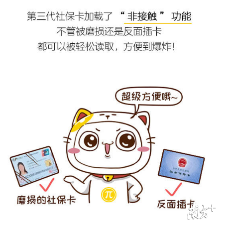 2.新增“闪付”功能。第三代社保卡采取非接触式读写,不管卡片磨损还是反面插卡,都可以被轻松读取,并且支持“一晃而过”的非接触式闪付功能,支付过程方便、快捷。
