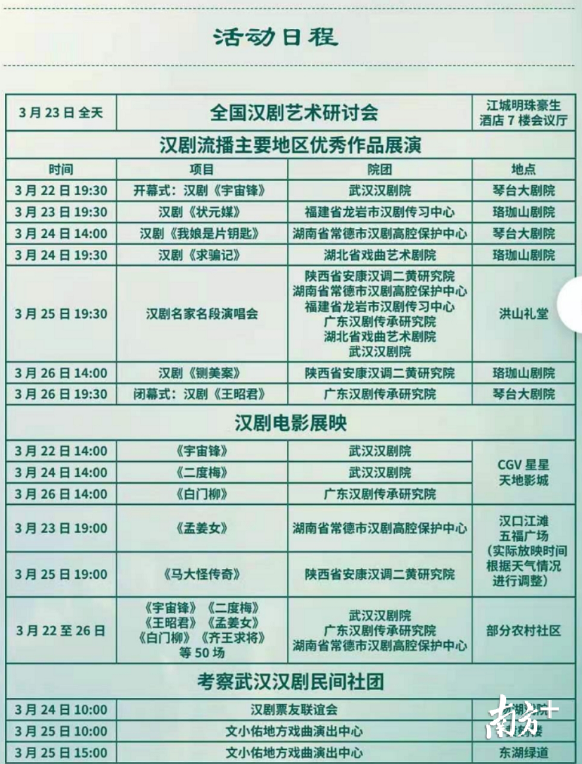 湖北、广东、福建、湖南、陕西等地共6家汉剧院团和国内30余位研究汉剧的专家将汇聚武汉,展演各地院团的精品汉剧剧目,共商汉剧发展传承。广东汉剧传承研究院作为广东省代表参演。