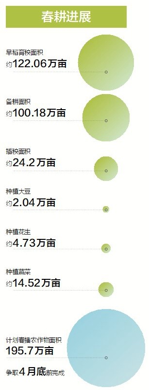 今年,梅州计划春播农作物195.7万亩,争取4月底前全面完成。截至目前,梅州早稻已育秧面积约122.06万亩,备耕面积约100.18万亩,插秧面积约24.2万亩;已种植大豆约2.04万亩,花生约4.73万亩,蔬菜约14.52万亩。