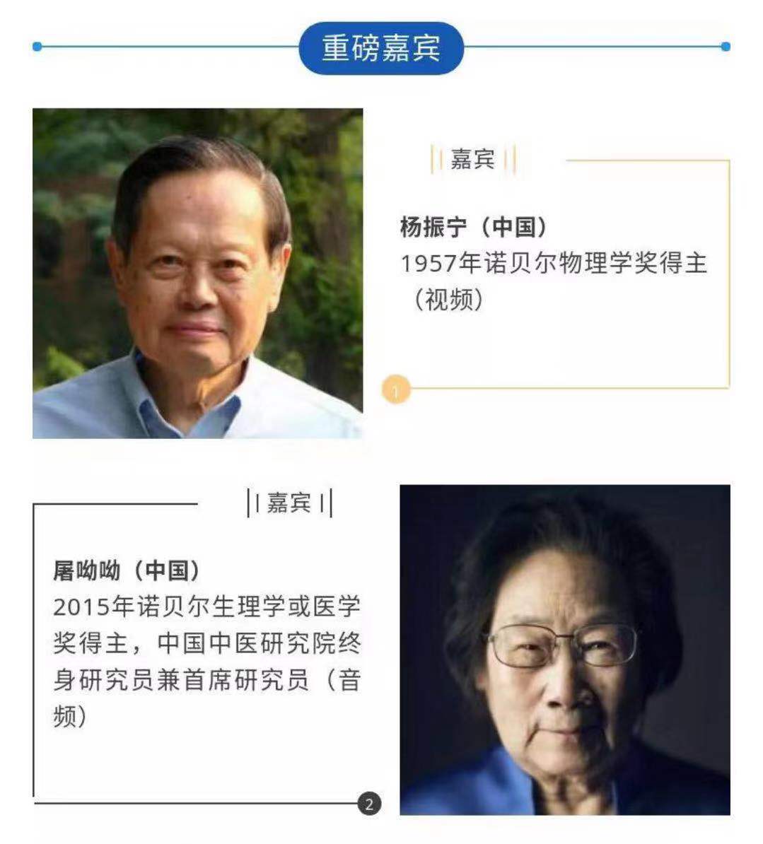 亮点2:中国两位诺贝尔奖获得者杨振宁、屠呦呦教授将以视频、音频形式参加活动;