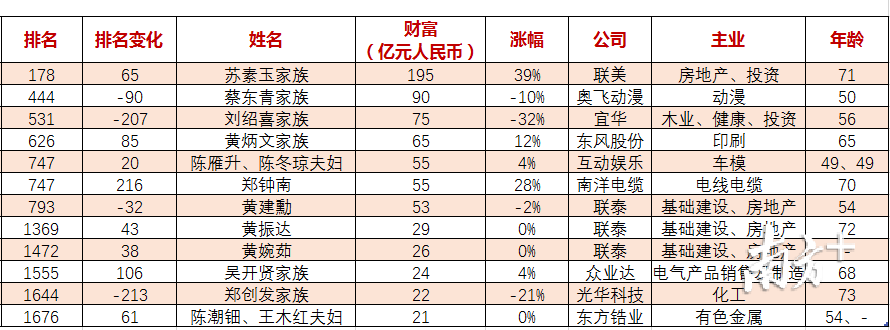 从上榜的汕头富豪排名情况来看,上升最明显的,当属南洋电缆郑钟南以及众业达吴开贤家族,排名分别上升了216、106位。