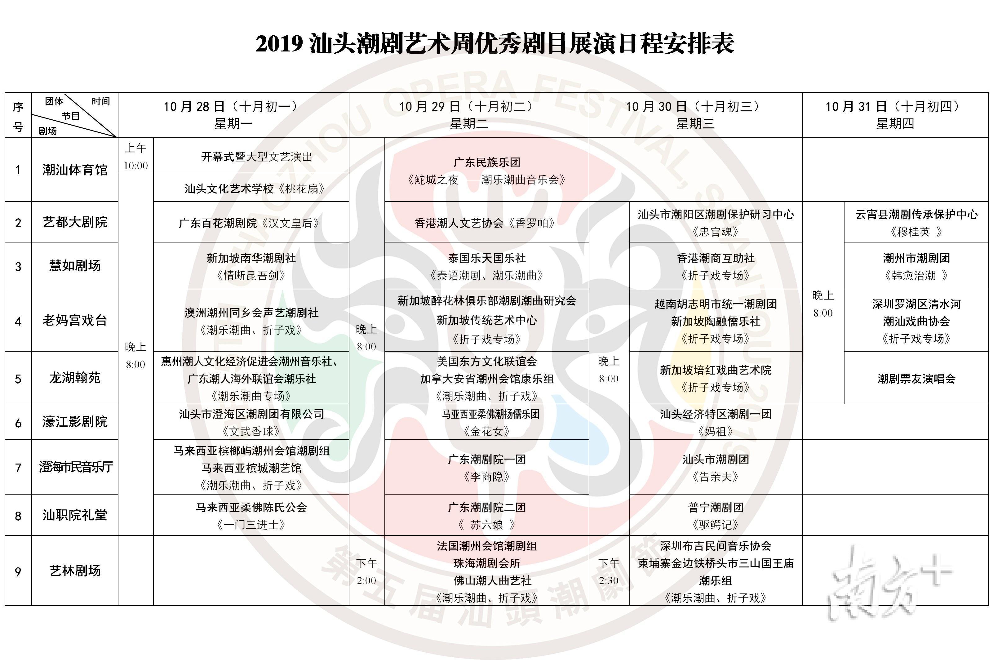 据了解,从10月28日到31日,38个潮剧团体将分别在潮汕体育馆、艺都大剧院、慧如剧场、老妈宫戏台、龙湖翰苑、濠江影剧院、澄海音乐厅、汕职院礼堂和汕头文化艺术学校艺林剧场为观众献上精彩演出。除展演优秀剧目外,还将举行鮀城之夜—潮乐潮曲音乐会、潮剧传承与发展研讨会、潮剧题材书画展、潮剧精品剧目展播等活动。本次活动聚焦时代主题,聚焦互动交流,聚焦艺术创新,聚焦文化惠民,为广大市民特别是潮剧爱好者呈现精彩的视听盛宴。