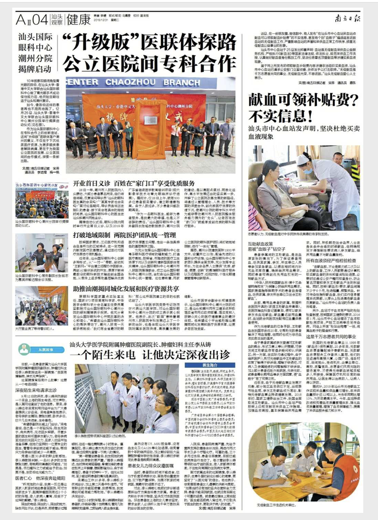 为充分发挥汕头国际眼科中心在粤东眼科医疗领域的辐射能力,打造医疗高地,按照省、市推进的医疗卫生资源下沉以及创新构建新型医联体有关精神,汕头国际眼科中心与潮州市人民医院强强联合,成立汕头国际眼科中心潮州分院,全权由汕头国际眼科中心统一管理。这也意味着,两家公立医院的眼科医护团队将打破地域限制,进行“一体化”管理。