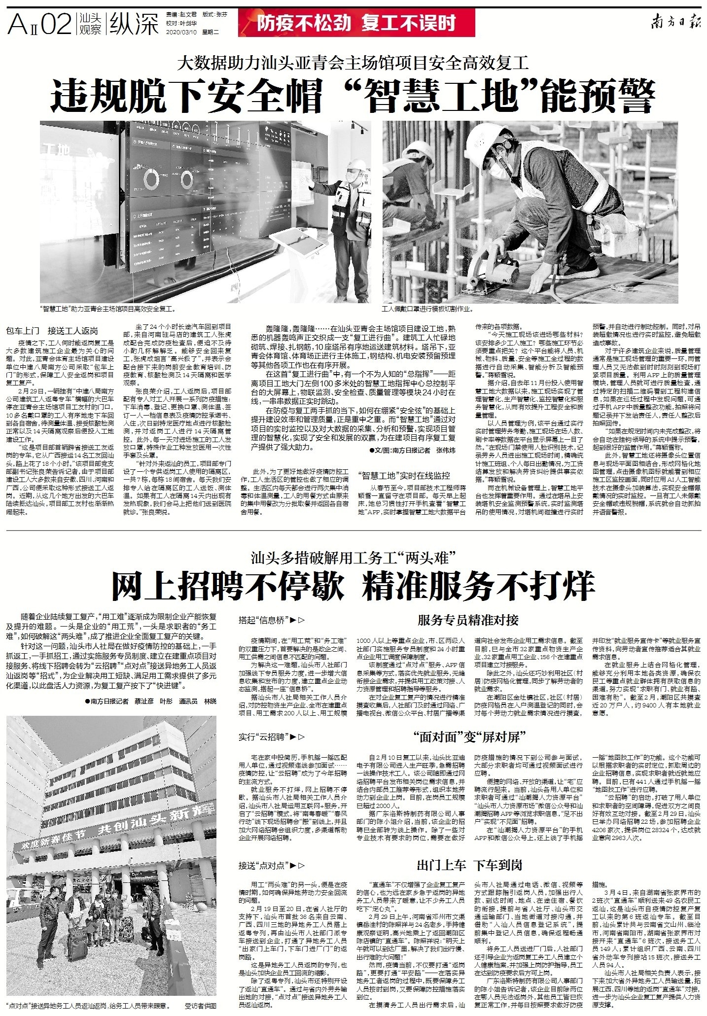 “针对外来返汕的员工,项目部专门设了一个专供返岗工人使用的隔离区,一共7栋,每栋18间宿舍。每天我们安排专人给在隔离区的工人送饭、测体温。如果有工人在隔离14天内出现有发热现象,我们会马上把他们送到医院就诊。”张良荣说。