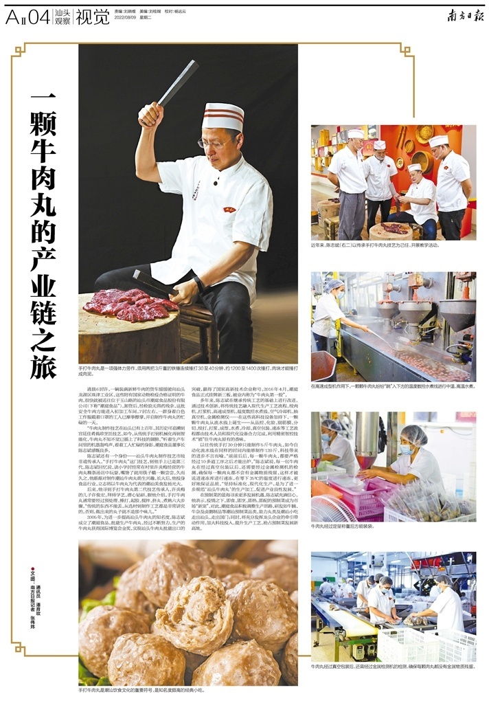“牛肉丸制作技艺在汕头已有上百年,其历史可追溯到宫廷佳肴捣珍烹饪技艺。如今,从传统手打到机械化再到智能化,牛肉丸不知不觉已插上了科技的翅膀。”听着生产车间里的机器轰鸣声,看着工人忙碌的身影,潮庭食品董事长陈志斌感慨良多。