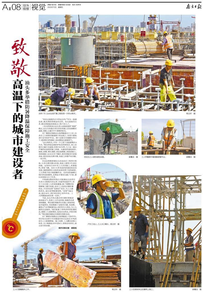 中铁建设集团有限公司新建汕头站项目负责人马银枪告诉记者,在夏季高温时节,项目十分注重工人的身体健康,除了调整时间错峰施工避开高温,还向工人发放足额防暑药品,不定时安排“送清凉”活动,为工人提供西瓜、绿豆汤等解暑食物。“如果气温太高,超过40℃,我们则会停止室外作业。工人的健康是排在第一位的。”