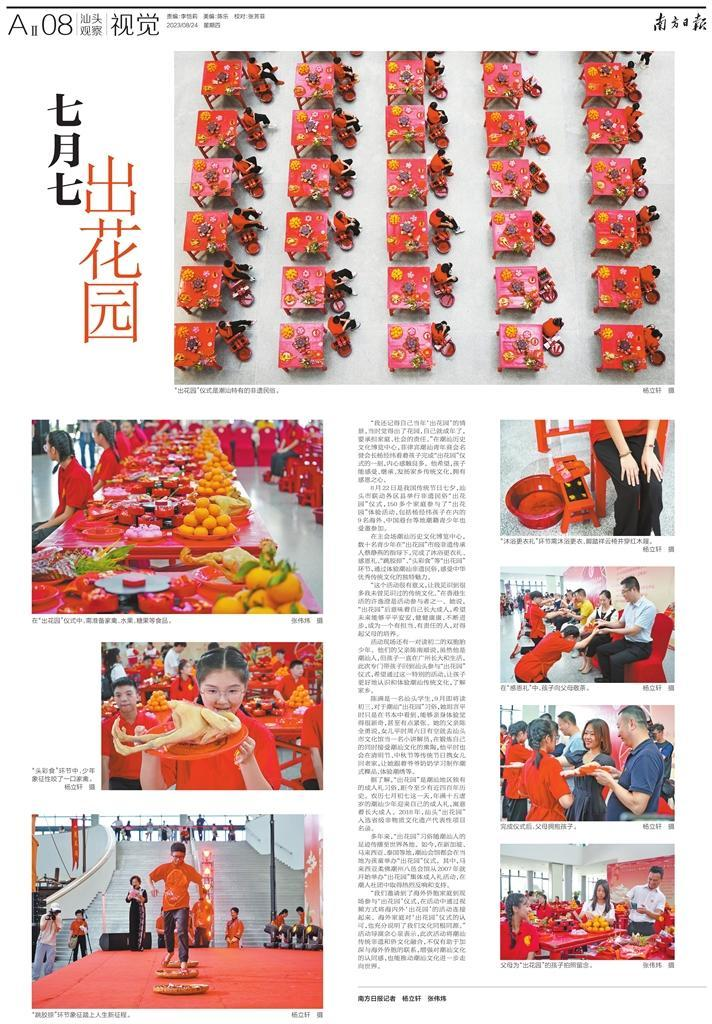8月22日是我国传统节日七夕,汕头市联动各区县举行非遗民俗“出花园”仪式,150多个家庭参与了“出花园”体验活动,包括杨经纬孩子在内的9名海外、中国港台等地潮籍青少年也受邀参加。