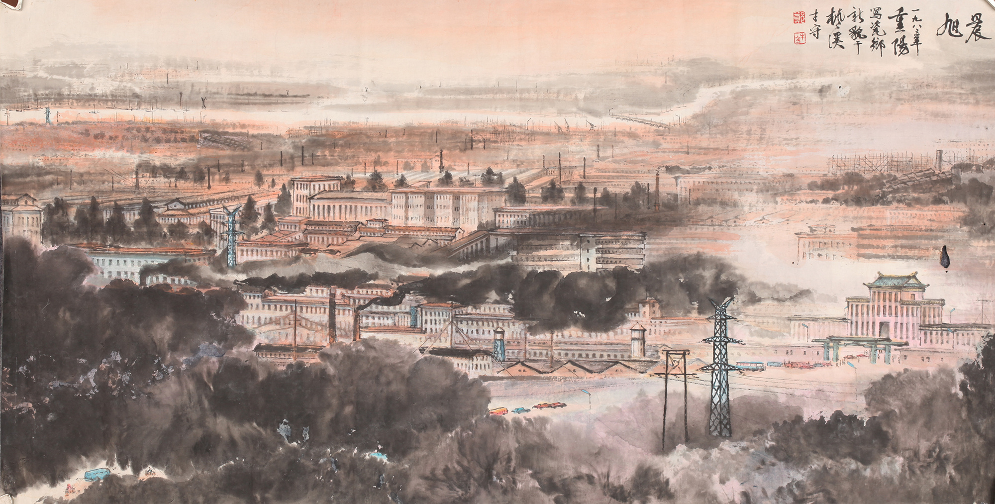 然而,在几十年前的潮州,龙窑并非现在这般如此稀罕。在颐陶轩潮州窑博物馆收藏的一张国画中可见一斑——这张由郑才守绘于1983年的《晨旭》,体现了彼时枫溪窑业的繁荣:满城都是黑烟囱。馆长李炳炎说,这些黑烟囱下就是一座座龙窑。