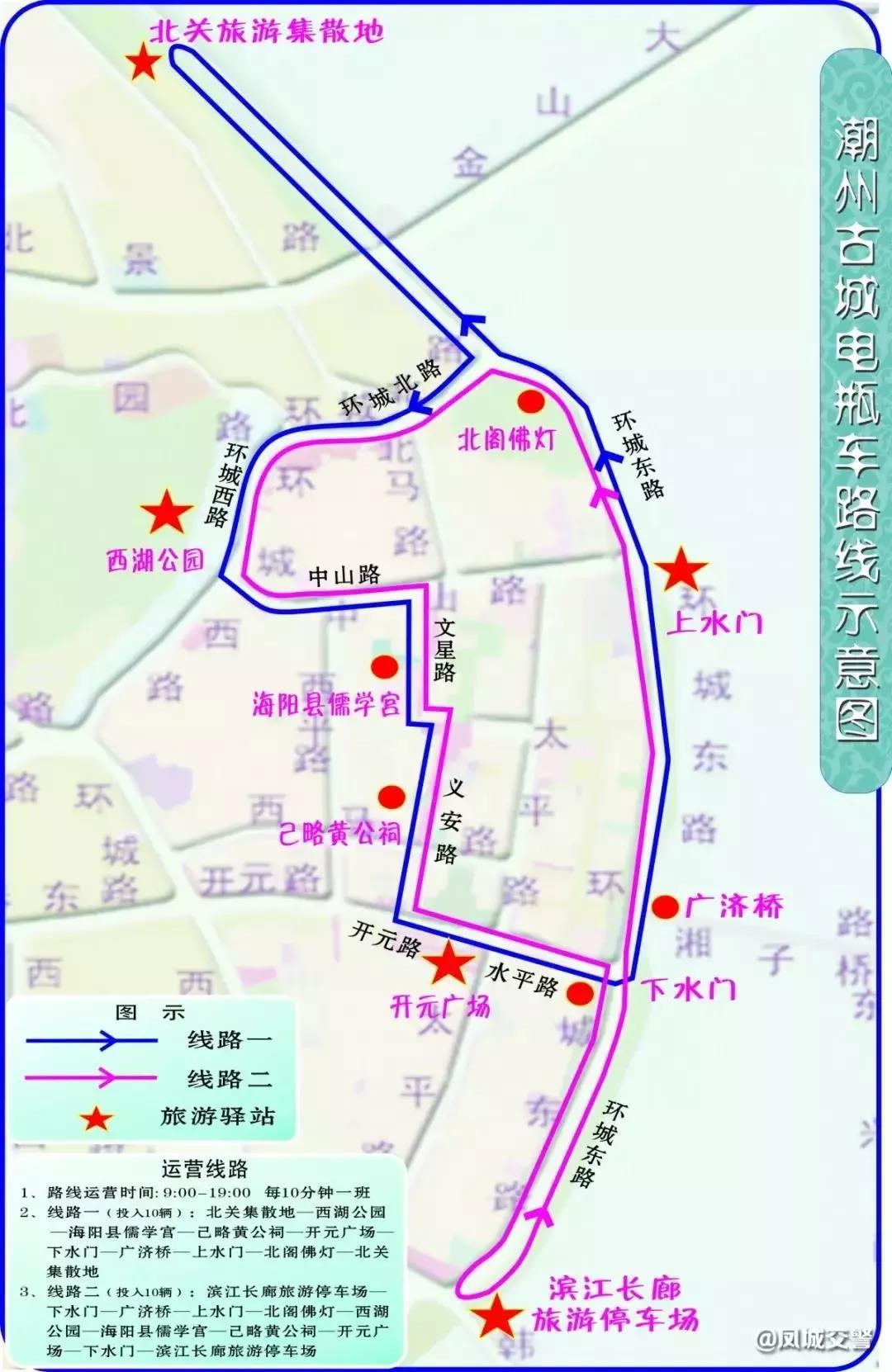 沿途站点:滨江长廊旅游停车场-下水门-广济桥-上水门-北阁佛灯-西湖公园-海阳县儒学宫-已略黄公祠-开元广场-下水门-滨江长廊旅游停车场