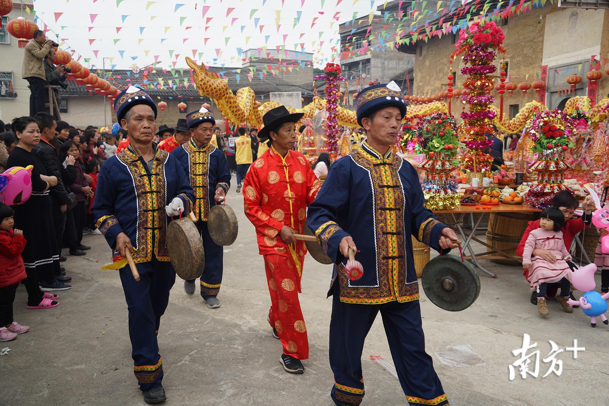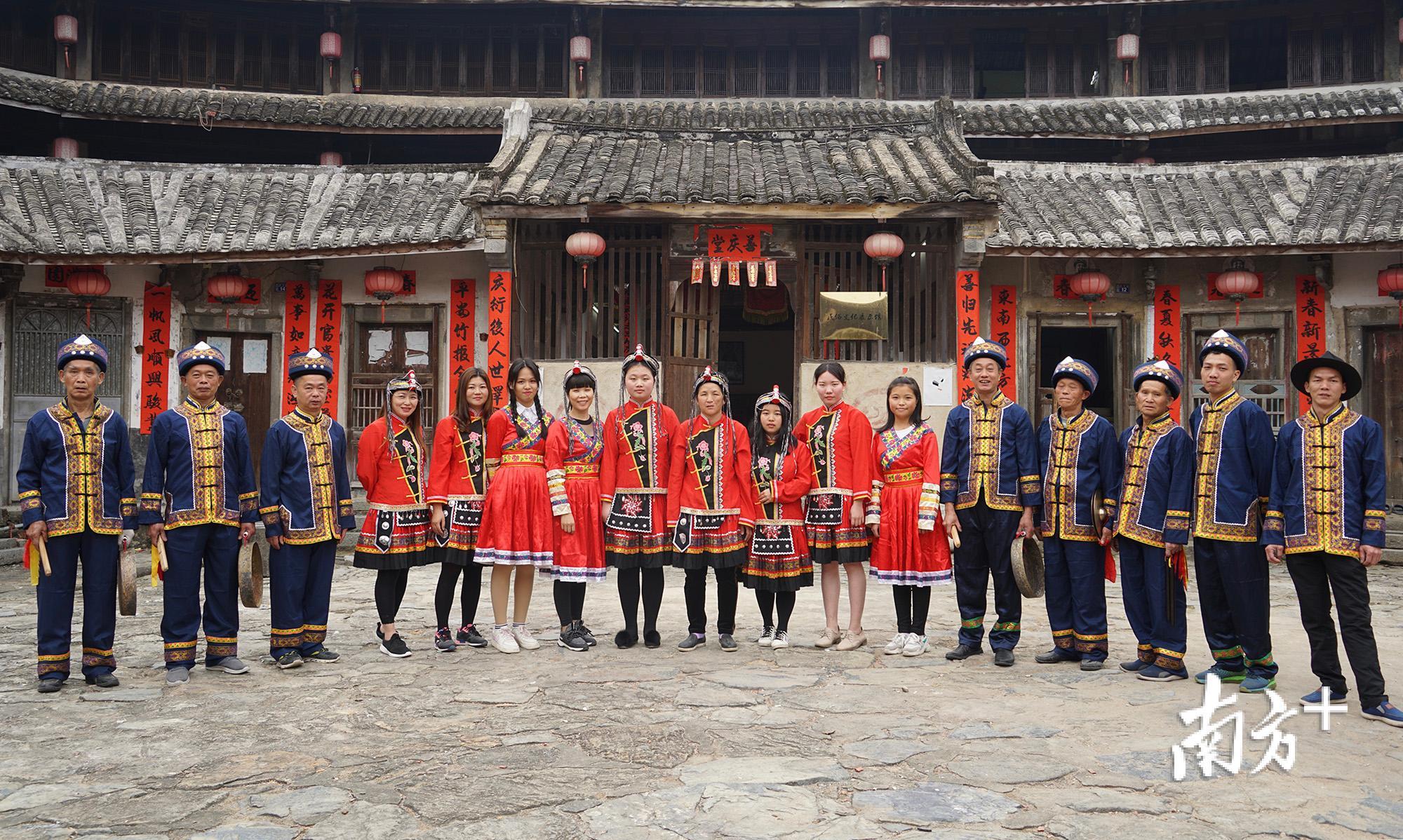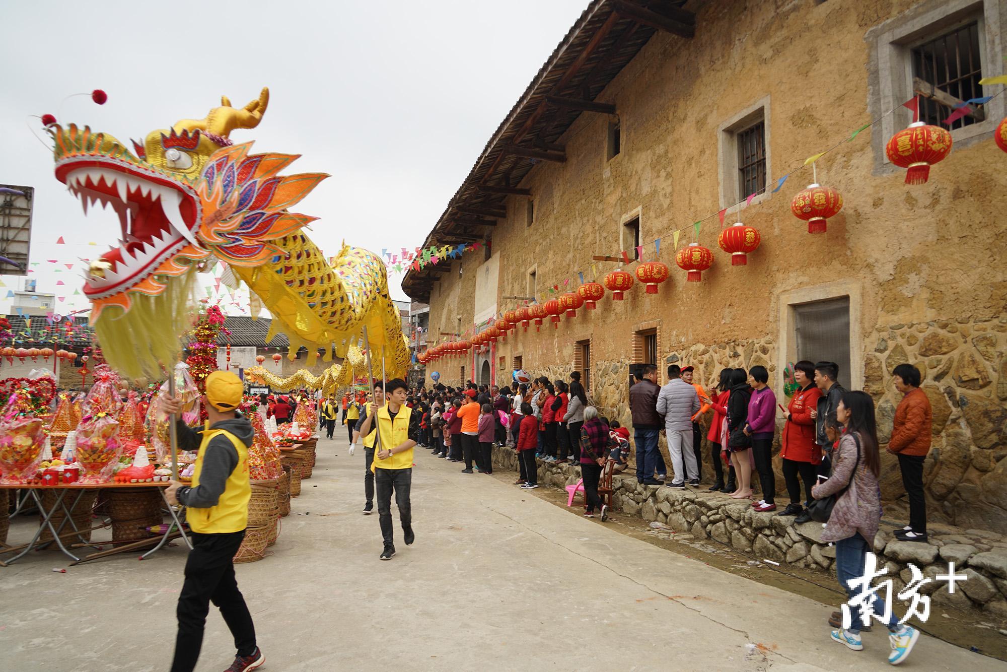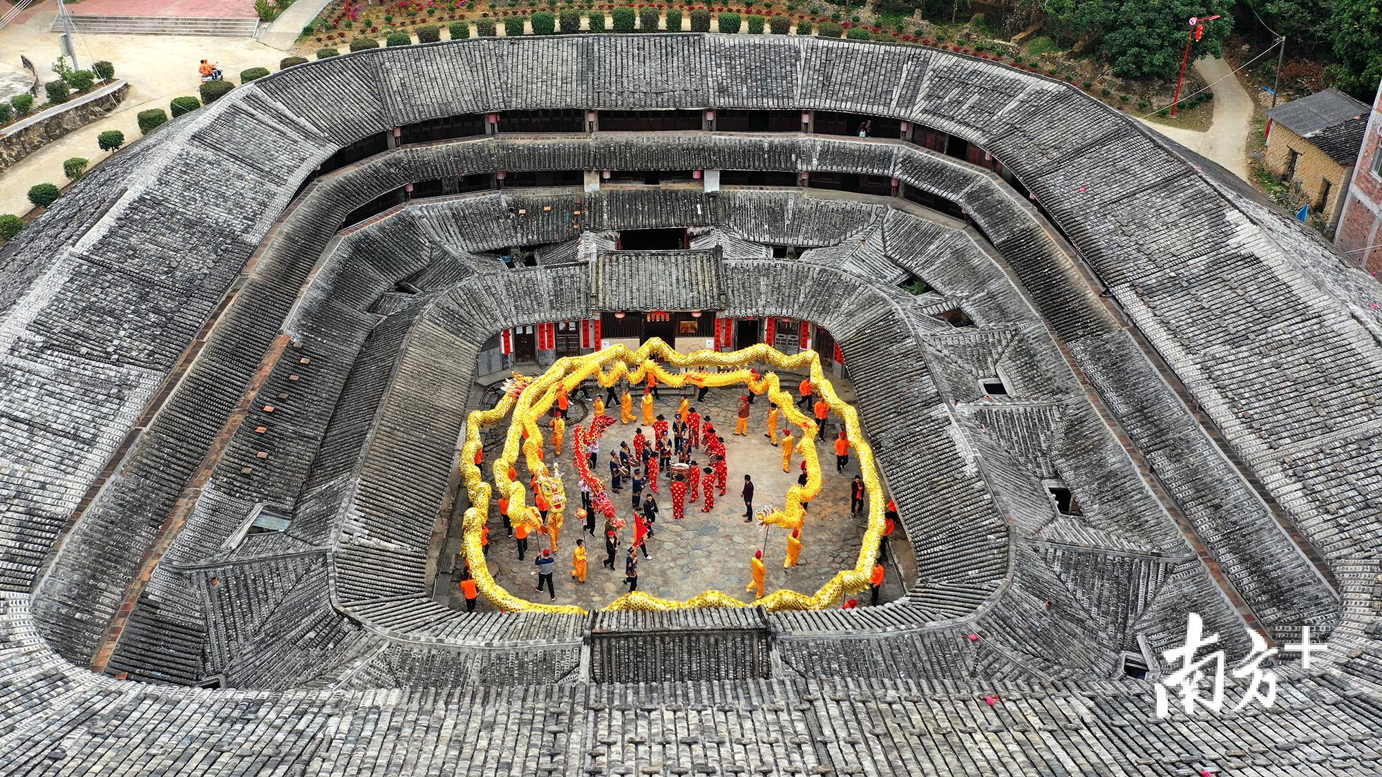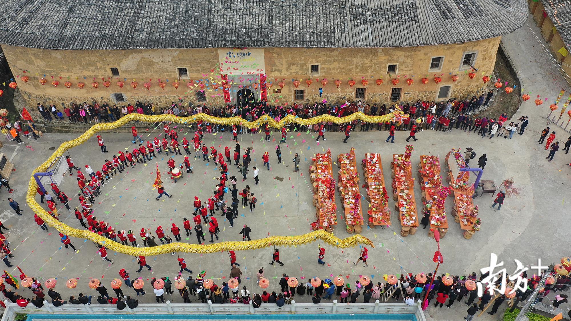 2月23日,潮州市饶平县饶洋镇,蓝屋畲族村的村民们身穿畲族服饰,在土楼——泰华楼内举行民俗游龙活动,村民舞起红、黄、绿等各色龙在围屋内外祈福闹新春,演绎别具风格的“民族风”。