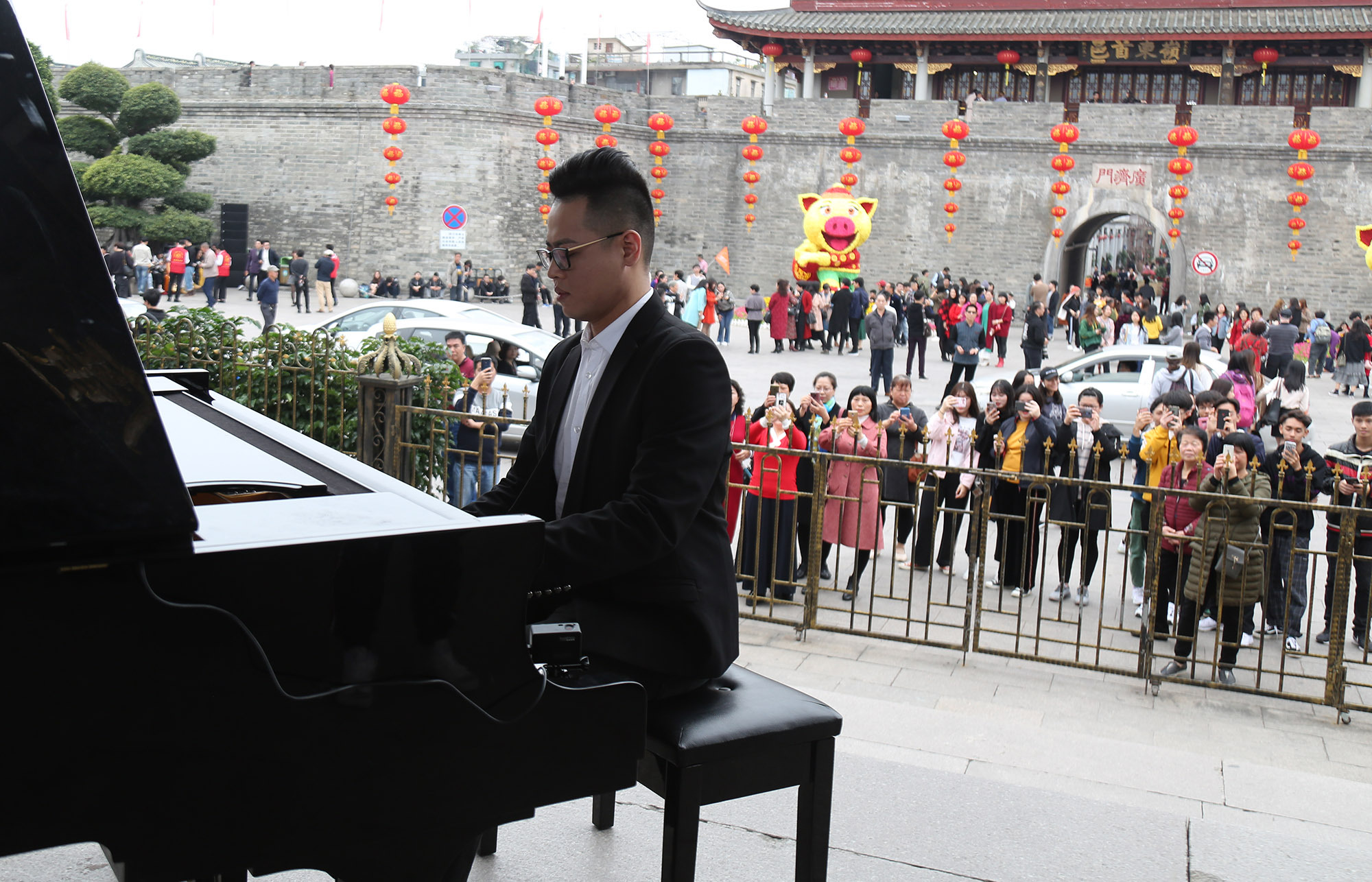 当天下午,广济桥上传来悠扬的钢琴声,城门洞中走出提琴手,将人们的目光吸引过来,歌手们在广场、在广济楼上相继唱响这首脍炙人口的歌曲。东门楼广场是连接潮州两处著名景点——广济桥和牌坊街的重要场所。随着音乐响起,来自潮州各行各业的人们以及各地游客不约而同地跟着唱起来,大家挥舞着手中的国旗,动情歌唱,歌声一时响彻云霄。最后,不少人还齐声高喊“我爱你,中国!”
