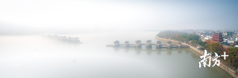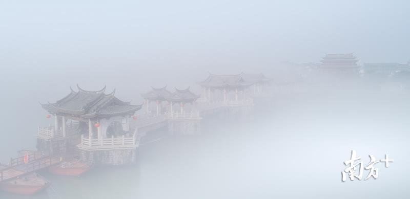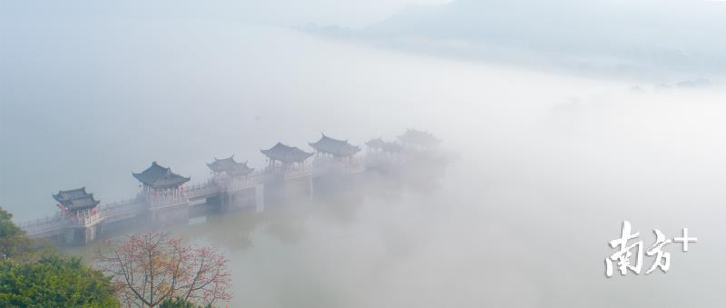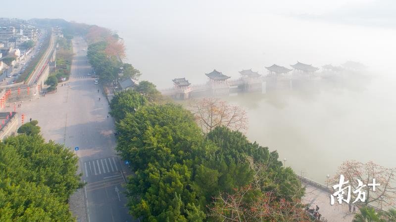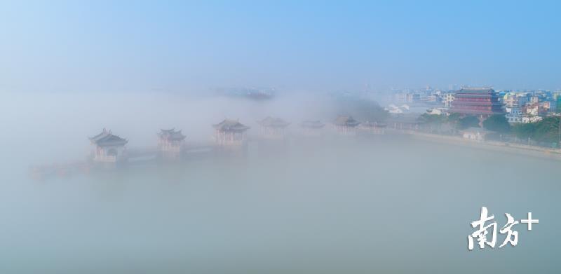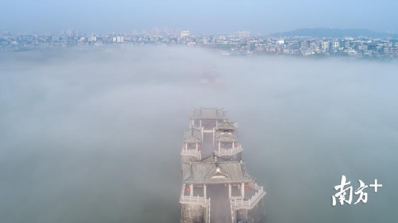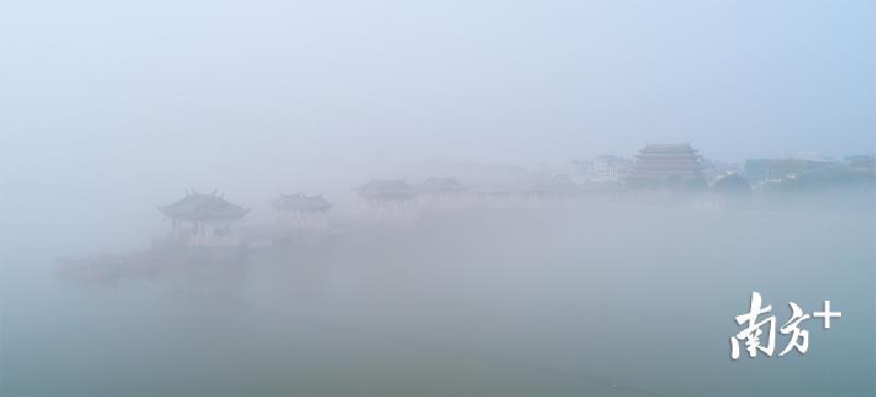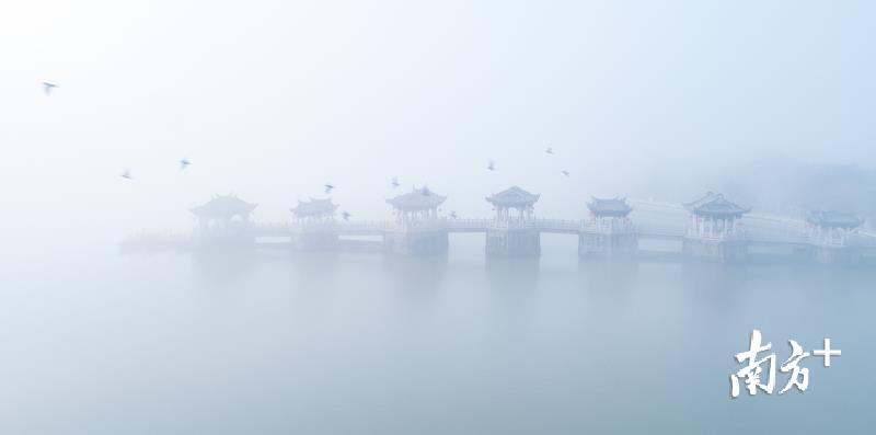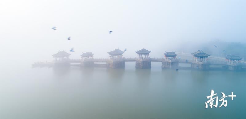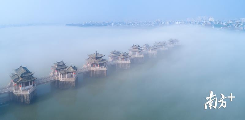今天早上,潮州市部分地区出现能见度小于500米的大雾天气。潮州气象台于今早6时26分发布大雾黄色预警信号,目前已解除。韩江边的湘子桥和古城在大雾中若隐若现,云雾弥漫,有如仙境。摄影师林文强用无人机拍下了这一短暂呈现的美景,令人赞叹不已。