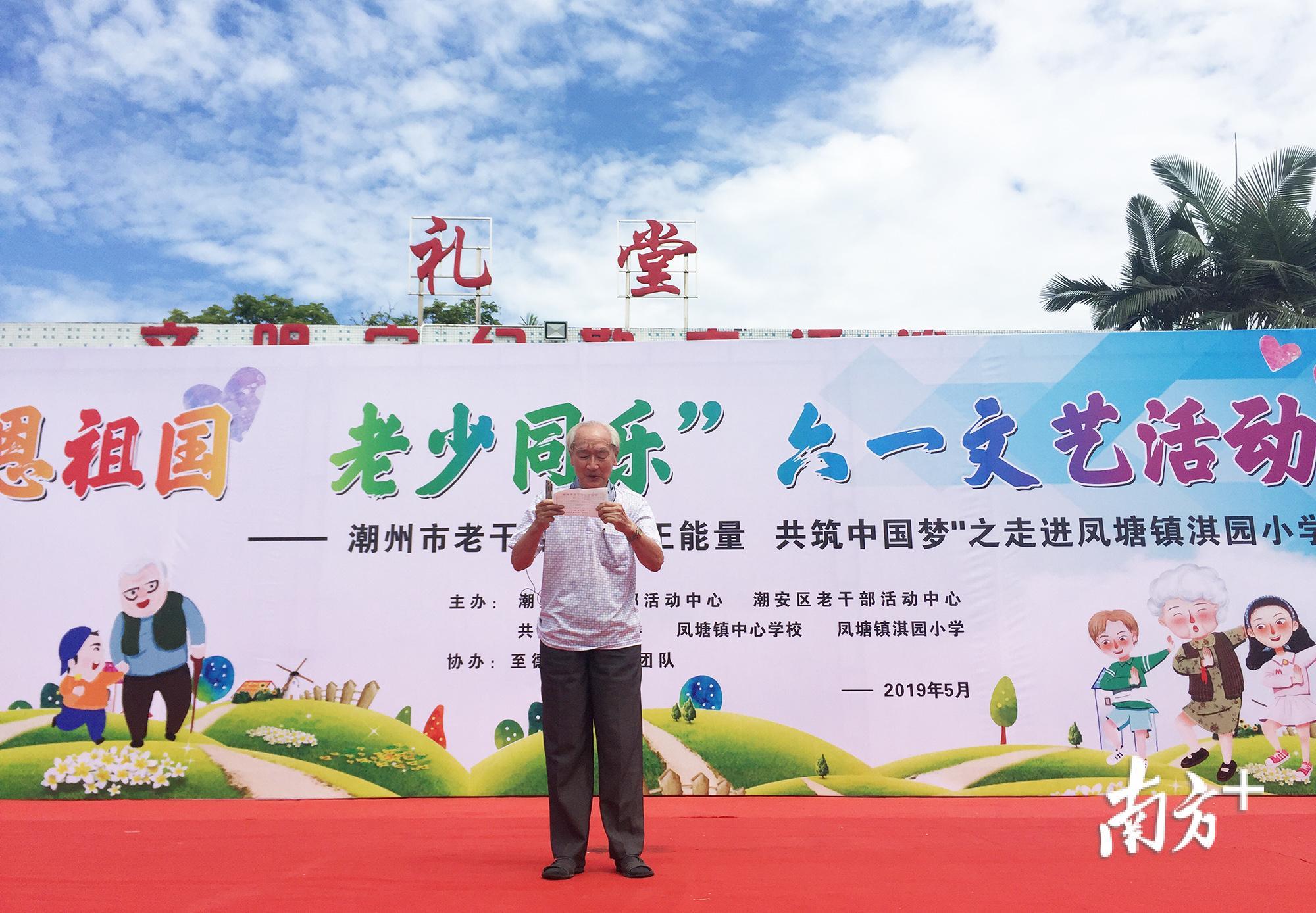 5月31日,潮州市老干部“感恩祖国,老少同乐”活动走进潮安区凤塘镇淇园小学,通过赠名著阅读、学习用品,捐奖助学金,办文艺演出等方式,为孩子们欢庆“六一”。现场,87岁高龄的潮州市老干部大学常务副校长卢璧锋慷慨激昂,赋诗奏曲。