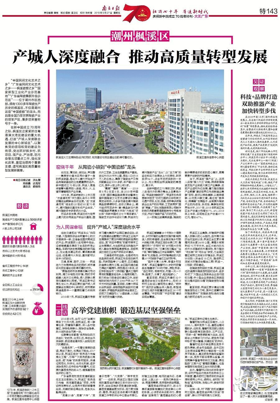 在新中国成立70周年之际,枫溪区正紧紧抓住粤港澳大湾区建设的重大机遇,打造“产城人深度融合发展的中心新城区”,以聚焦党的领导和党的建设为统领,突出抓好振乡村、抓项目、强产业、严治理、防污染等五项重点工作,强化深化改革、基层治理两个重要支撑,谱写枫溪区高质量转型发展新篇章。