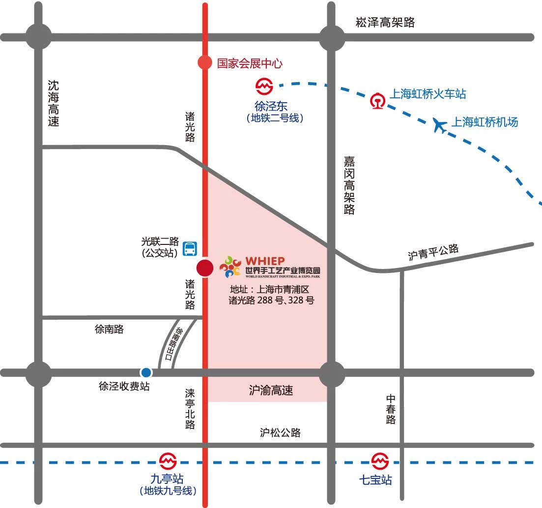 世界手工艺产业博览园位于上海市青浦区诸光路288号,距离中国国际进口博览会永久会址——国家会展中心约3公里。该园是2017年上海市《关于加快本市文化创意产业创新发展的若干意见》中重点布局的文化公共载体,被列入上海市文化创意产业推进领导小组办公室重点支持项目;也是“十三五”期间《上海市工艺美术产业发展三年行动计划》的重大项目。