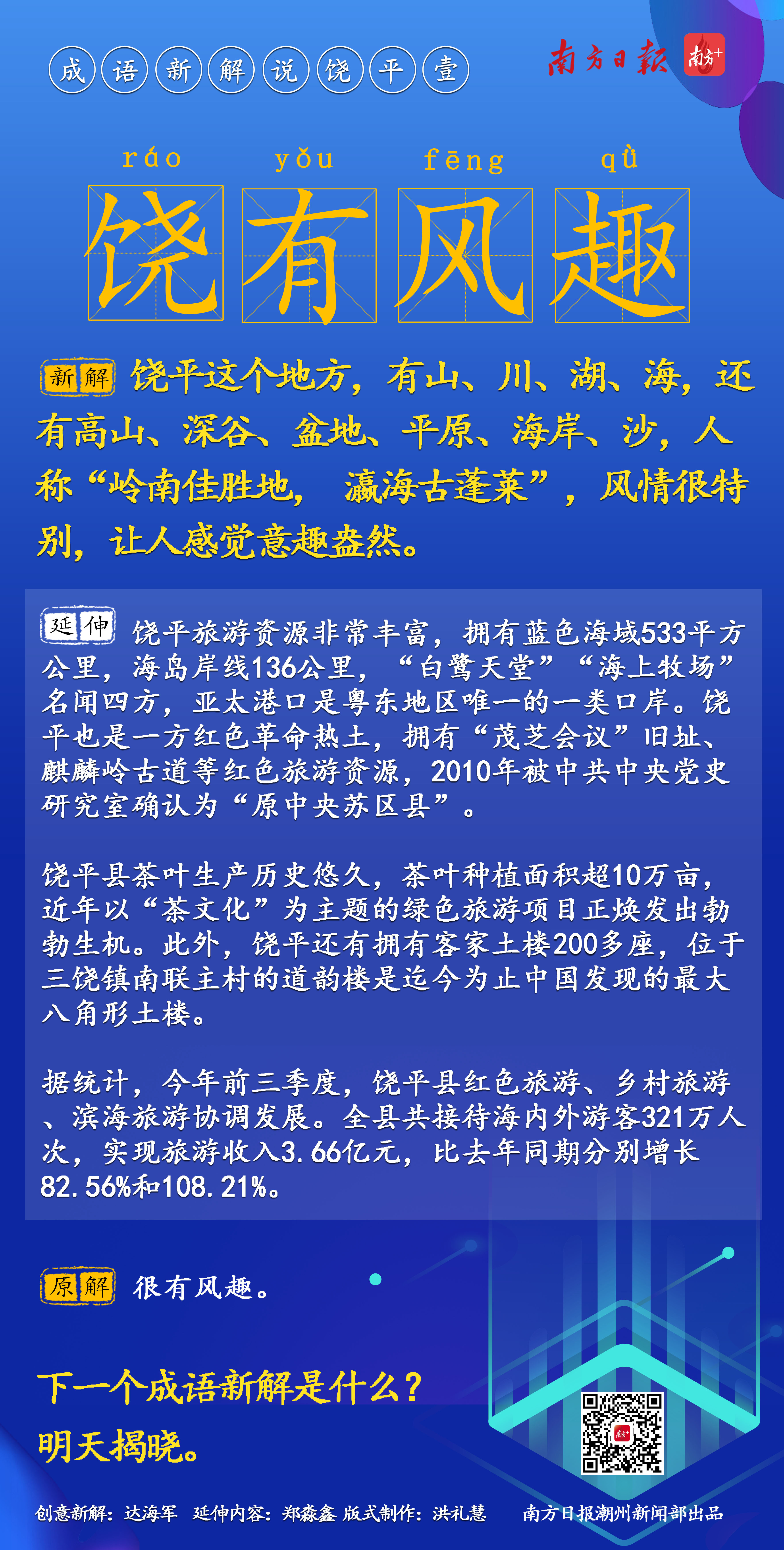 对此,南方日报潮州新闻部根据上述“饶平现象”,推出“成语新解说饶平”系列创意报道,以轻松有趣的方式呈现饶平的发展面貌和成效。同时,也欢迎大家踊跃参与,有经典的成语新解,可以在评论区留言,我们将择优刊发。