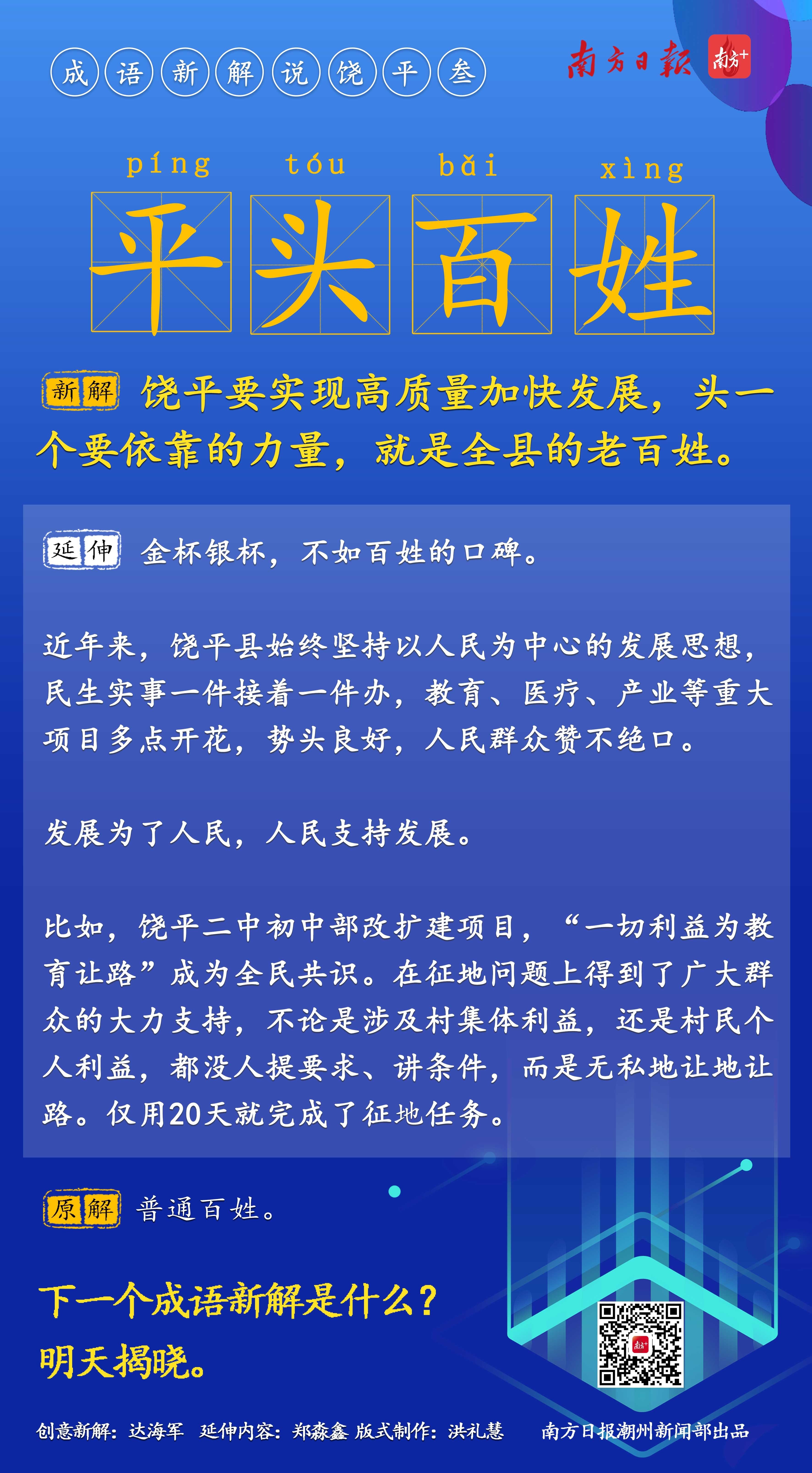 对此,南方日报潮州新闻部根据上述“饶平现象”,推出“成语新解说饶平”系列创意报道,以轻松有趣的方式呈现饶平的发展面貌和成效。同时,也欢迎大家踊跃参与,有经典的成语新解,可以在评论区留言,我们将择优刊发。