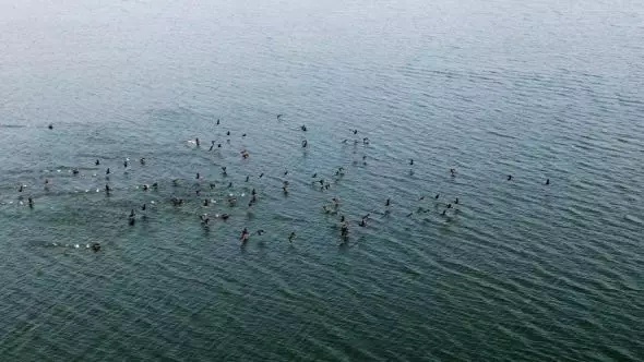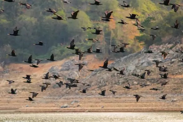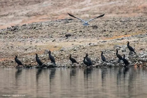近日,饶平县迎来了一群从北方前来过冬的鸟儿朋友。只见它们或在水面盘旋、觅食,或惬意地在汤溪水库的生态岛上空翱翔。这些鸟儿,种类繁多,有鸬鹚、大白鹭、小白鹭、池鹭、凤头鸊鷉(pì tī)等,其中数量最多的当属鸬鹚。今年到汤溪水库的过冬的鸬鹚比往年多50%,约有6群共2000多只!