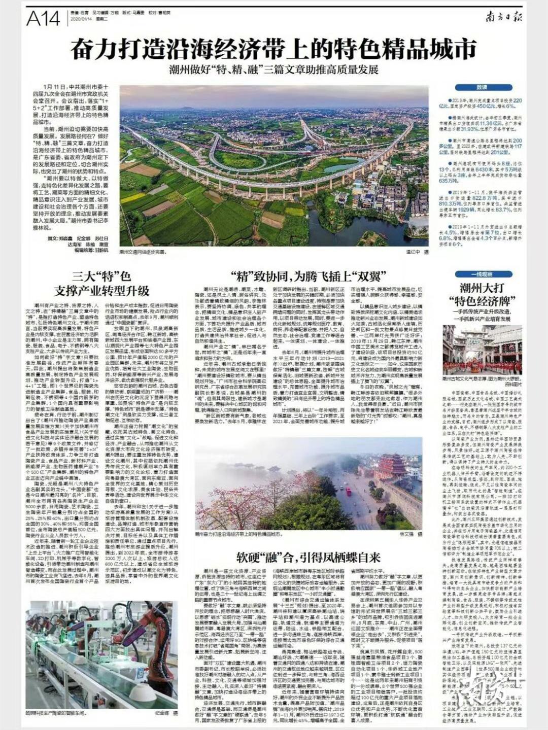 潮州有产业之特、资源之特、人文之特。在“特精融”三篇文章中的“特”,是指打造特色产业、塑造特色城市、弘扬特色潮州文化。于潮州而言,当前要实现高质量发展,特色产业是内核支撑。在民营经济较为活跃的潮州,中小企业是主力军,拥有陶瓷、服装、食品、电子、不锈钢等八大支柱产业,大多以传统产业为主。